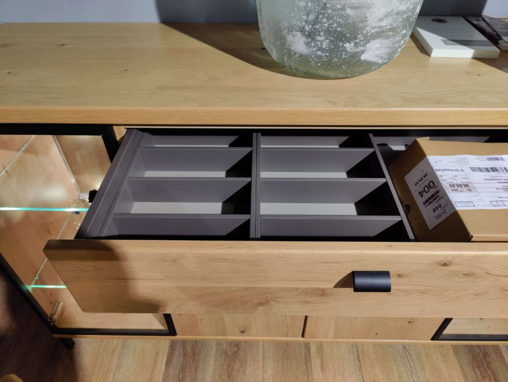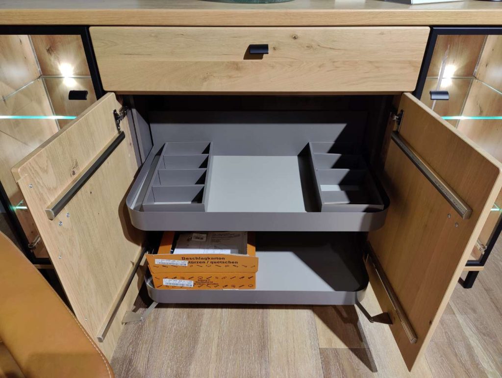 Ein besonderes Highlight der Viva-Ausführung ist die integrierte Beleuchtung, die für eine stimmungsvolle Inszenierung Ihrer Lieblingsstücke sorgt. Zudem umfasst das Möbelstück einen praktischen Tablarauszug sowie eine Schubkasten-Einteilung, die für zusätzliche Flexibilität und Ordnung in Ihrem Zuhause sorgt. Made in Germany verspricht eine herausragende Verarbeitungsqualität, die sich sowohl in der Langlebigkeit als auch in der Detailverliebtheit dieses exquisiten Möbelstücks widerspiegelt. Entdecken Sie mit Viva ein Möbelstück, das sowohl in Sachen Design als auch Funktionalität Maßstäbe setzt.