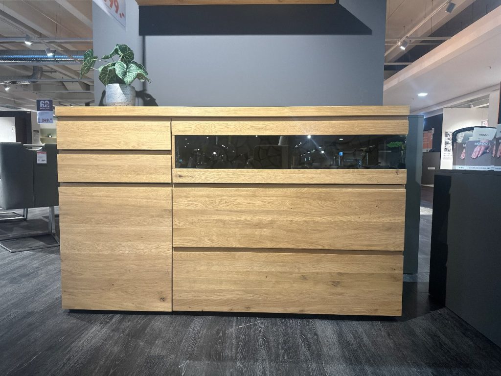 Bemerkung Sideboard: B/H/T ca. 180x109x43 cm, Wildeiche hell soft gebürstet geölt, teilmassiv darin enthalten: Rückwand Kaminholzoptik, LED- Beleuchtung, Ambiente-Beleuchtung, Trafo Wandboard: b/H/T ca. 147x24x22 cm, Wildeiche hell soft gebürstet geölt, teilmassiv, absetzung anthrazit matt darin enthalten: Ambiente-Beleuchtung, Trafo