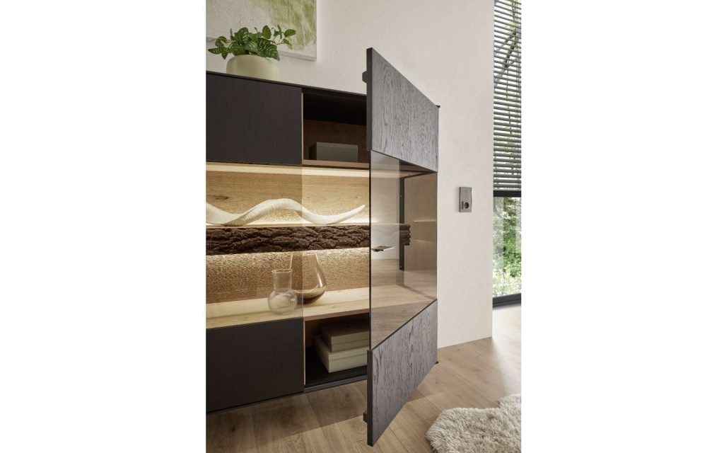 Bemerkung Sideboard in Kerneiche Natur massiv gebürstet, Applikation in anthrazit gebeizt, 2 Holz-Glastüren, 1 Rindenboden, 2 Holzböden, B/H/T ca. 125 x 119 x 39 cm.