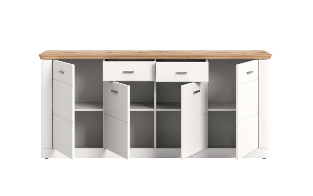 BemerkungSideboard mit Front aus MDF in Weiß, matt, tiefgezogen, Korpus in Weiß, matt, Absetzung in Nox Oak Nachbildung, Griffe aus Kunststoff in Nickelfarbig, Kunststofffüße in Schwarz, 4 Türen, 2 Schubkästen, 4 Einlegeböden, B/H/T ca. 195 x 87 x 40 cm.