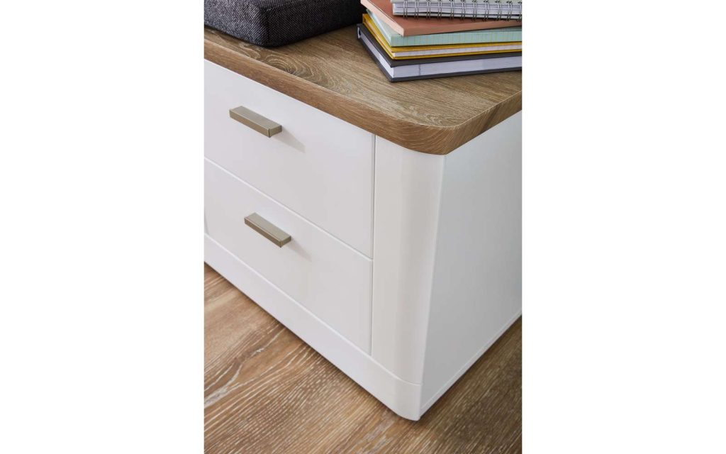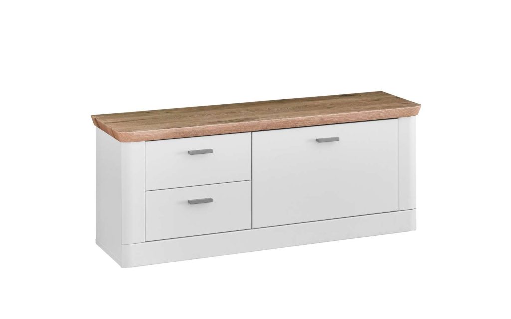 Sitzbank mit Front in Weiß matt und Korpus in Weiß, Absetzung in Nox Oak-Nachbildung, Griffe in Nickel, ohne Sitzkissen, 1 Klappfach, 2 Schubkästen, B/H/T ca. 125 x 50 x 37 cm