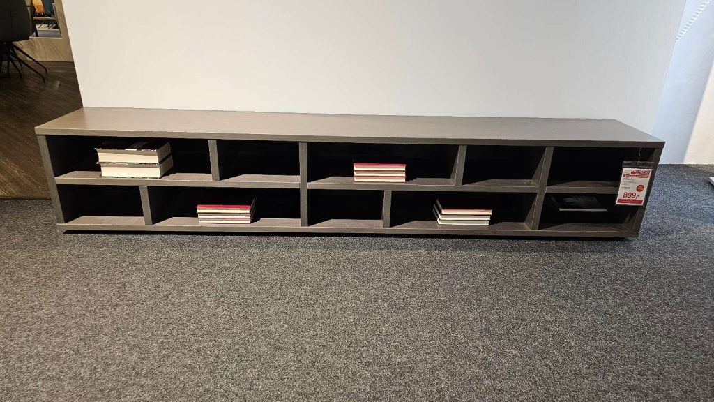 Bemerkung Das Bücherregal Valea 61980 von Varianta präsentiert sich als ein eindrucksvolles Möbelstück, das sowohl durch seine Ästhetik als auch durch seine Funktionalität besticht. In einer ansprechenden Akzentausführung zeigt es sich in einem Feinschliff grigio, der dem Regal eine elegante und zeitgemäße Optik verleiht. Die hochwertige Verarbeitung der Wangen, Böden und des Sichtrückens sorgt nicht nur für eine ansprechende Erscheinung, sondern auch für eine außergewöhnliche Stabilität. Mit seinen großzügigen Maßen von etwa 230 cm in der Breite, 43 cm in der Höhe und 37 cm in der Tiefe bietet das Regal reichlich Platz für Ihre Büchersammlung oder für dekorative Elemente, die Sie stilvoll in Szene setzen möchten. Die robusten Sockelgleiter mit Sichtrücken gewährleisten einen sicheren Stand und unterstützen die langlebige Qualität des Möbels. Trotz seiner Funktion als Ausstellungsware, zeichnet sich das Modell durch seine hervorragende Verarbeitung aus und verspricht, in jedem Raum ein zeitloses Highlight zu sein.