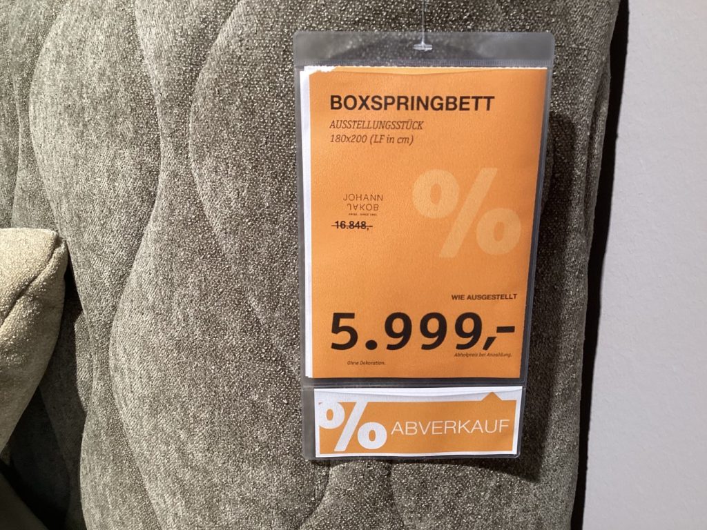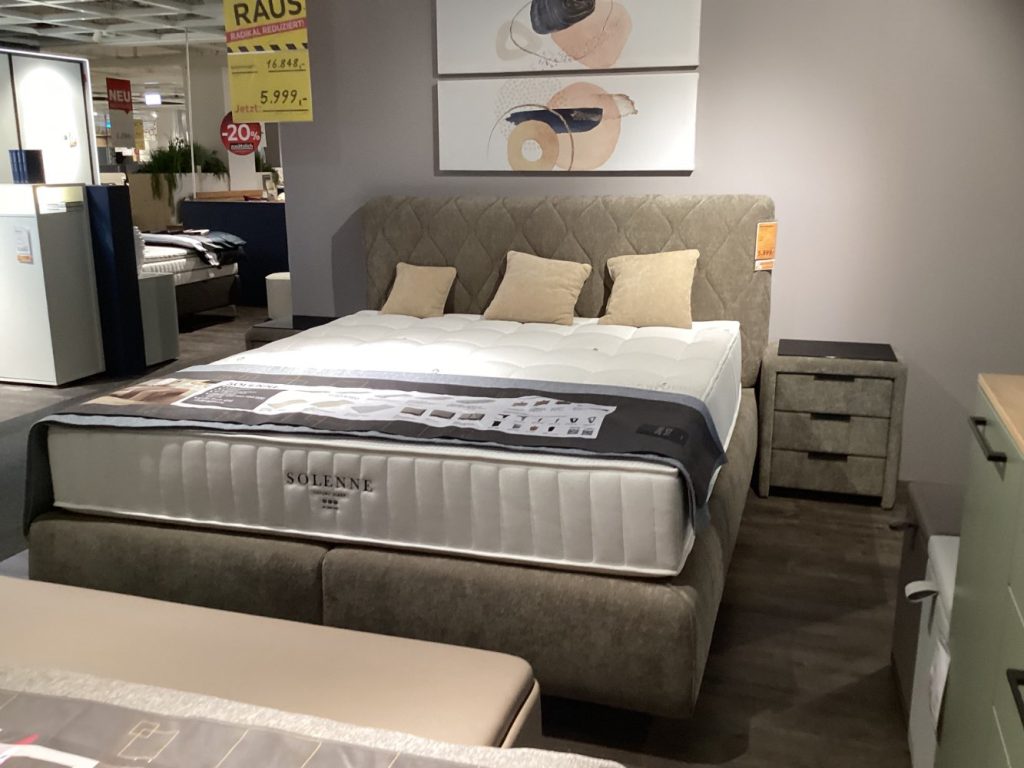 BemerkungDas Modell Solenne-Exklusiv ist ein außergewöhnliches Boxspringbett, das durch seinen luxuriösen Stil und seine Exklusivität besticht. Als Ausstellungsstück aus der Kategorie der Boxspringbetten vereint es hochwertiges Design mit einem Hauch von Opulenz. Der Stoffbezug in einem eleganten Grün-Grau mit einem feinen Samtstich verleiht dem Bett eine unaufdringliche, aber dennoch beeindruckende Ästhetik. Dieses Bett wurde sorgfältig gestaltet, um jedem Schlafzimmer eine moderne und zugleich klassische Note zu verleihen.