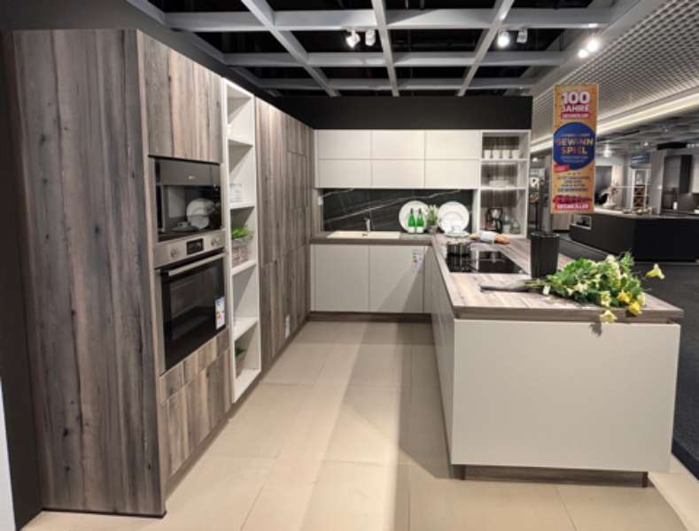 Bemerkung Die Sormani Pura / Latina U-Küche zeigt sich in einem zeitlosen, klassischen Design, das Eleganz und Funktionalität nahtlos vereint. Die Fronten in muschelweißem Matt verströmen eine dezente Raffinesse, während die Rillenoptik der dunkel eichefarbenen Teile einen stilvollen Kontrast bietet. Diese Kombination verleiht der Küche eine warme, einladende Atmosphäre und macht sie zum perfekten Mittelpunkt in jedem Zuhause. Die grifflosen Schränke betonen das minimalistische Design und sorgen für eine nahtlose Optik, die den klassischen Stil dieser Ausstellungsküche unterstreicht. In Verbindung mit den Elektrogeräten in Schwarz und Edelstahl hebt sich die Küche durch ihre moderne Eleganz hervor und bietet gleichzeitig eine zuverlässige Funktionalität. Diese U-Küche von Sormani verbindet traditionelle Ästhetik mit zeitgenössischen Akzenten und schafft so einen Raum, der sowohl zum Kochen als auch zum geselligen Beisammensein einlädt.