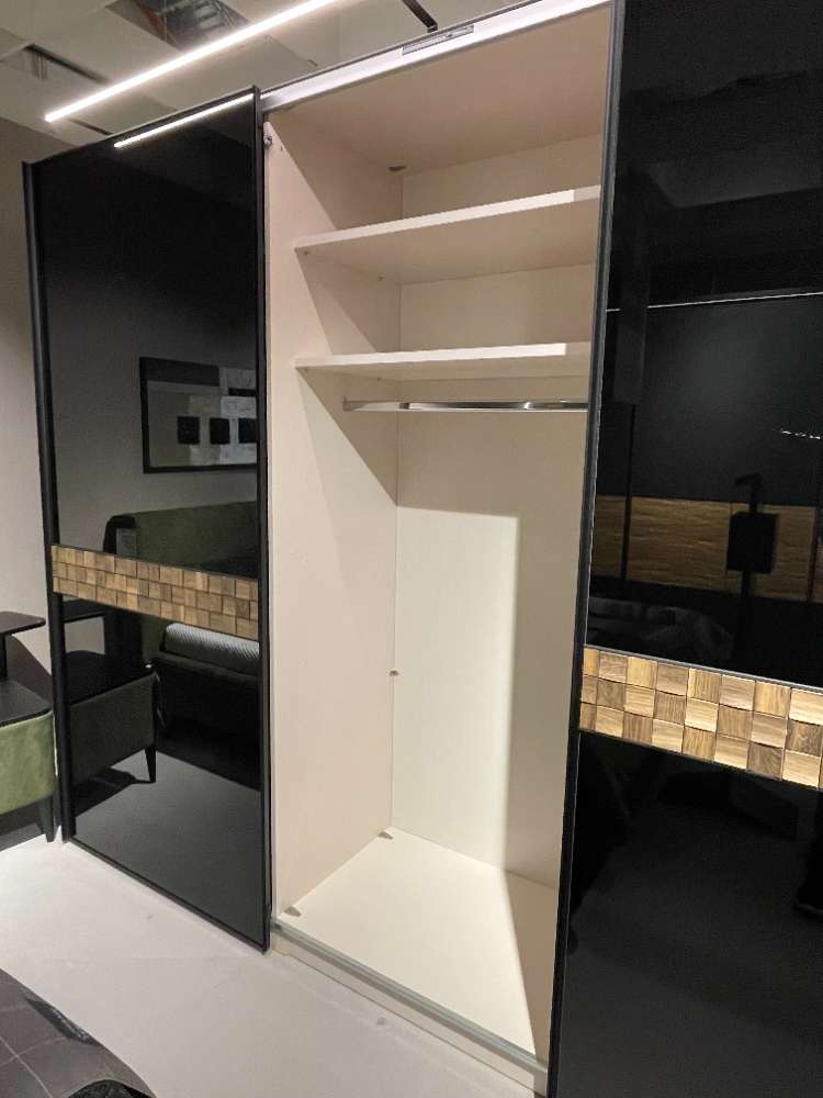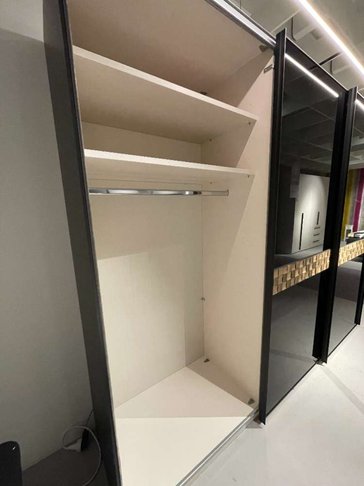 Bemerkung 3-türiger Schwebetürenschrank Farbe: hochglanz schwarz mit Holzapplikationen Maße: 280x222x68cm 6 Einlegeböden 3 Kleiderstangen