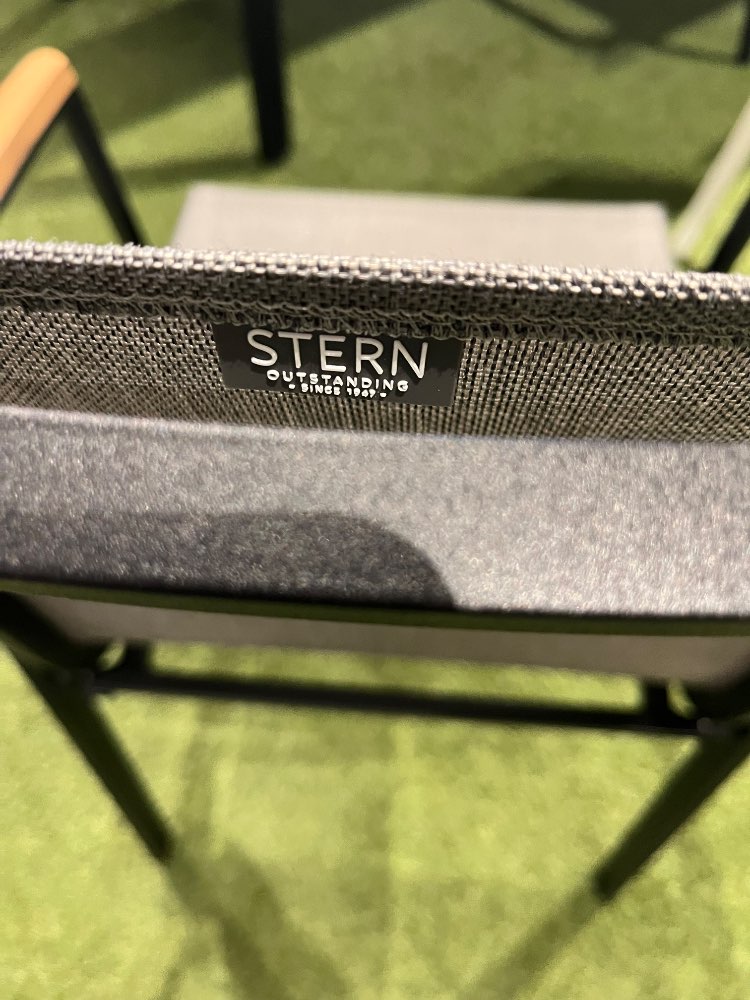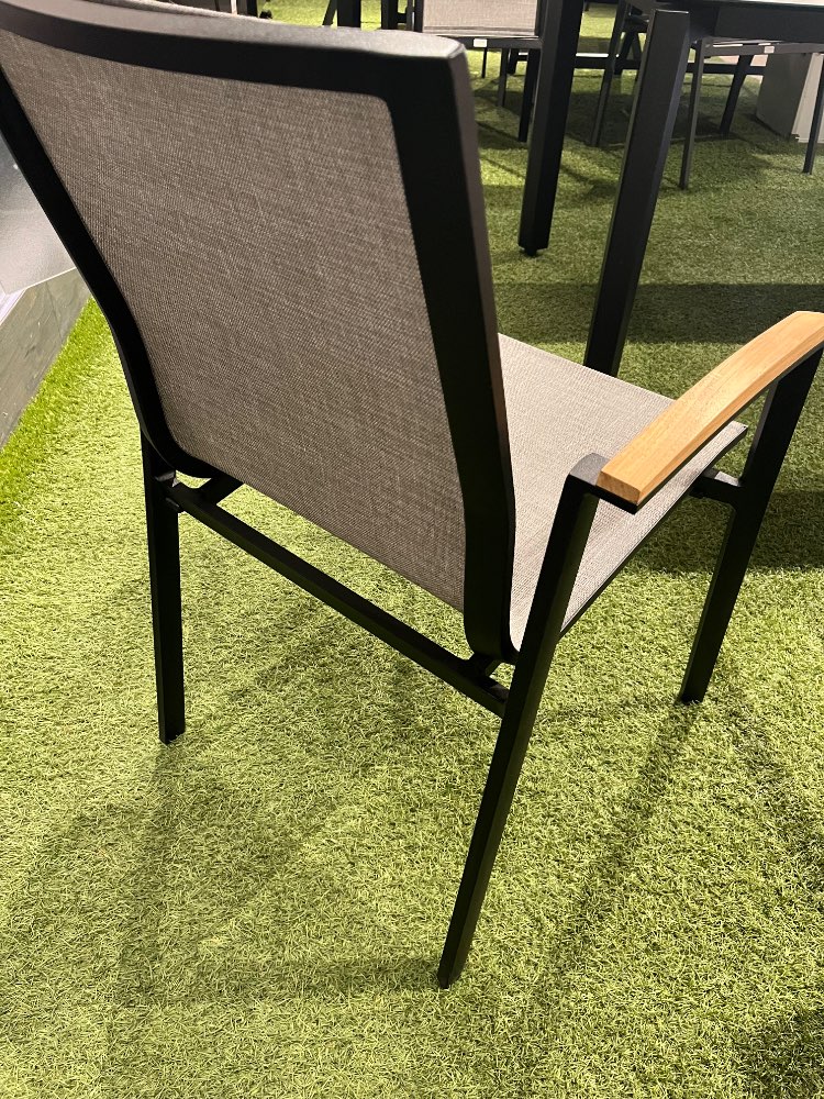 Gartenstuhl von STERN Gestell aluminium matt schwarz Bezug Leinen grau mit Teak Armlehnen ohne Dekoration