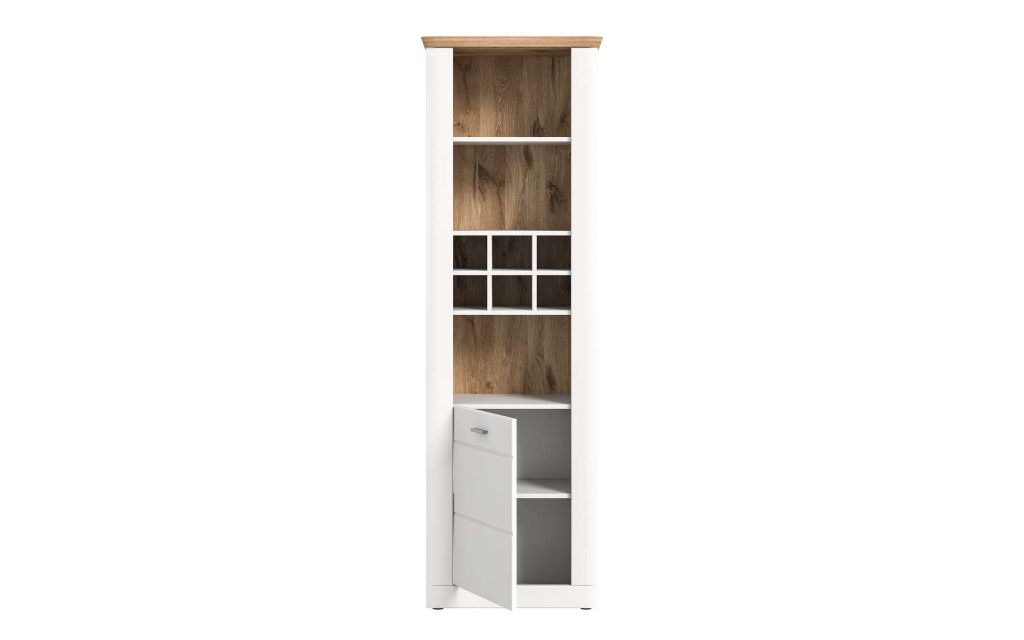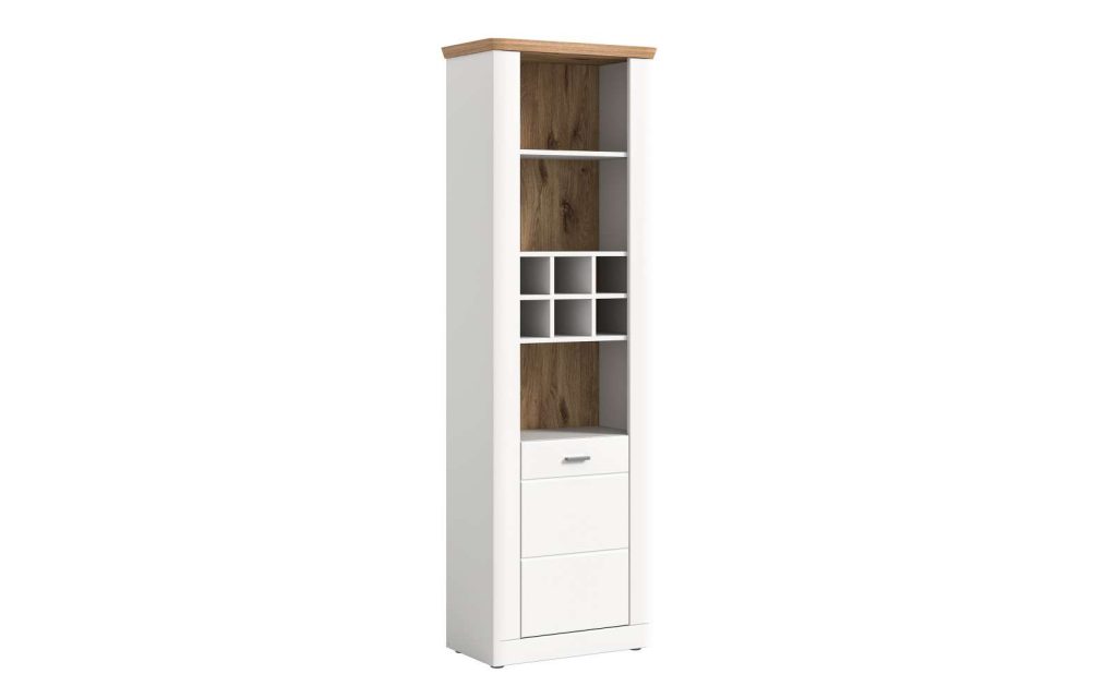 BemerkungStauraumregal mit Front aus MDF in Weiß, matt, tiefgezogen, Korpus in Weiß, matt, Absetzung und Rückwand in Nox Oak Nachbildung, Griffe aus Kunststoff in Nickelfarbig, Kunststofffüße in Schwarz, 1 Tür, 1 Einlegeboden, 4 Konstruktionsböden, 6 kleine Fächer, B/H/T ca. 65 x 205 x 37 cm.
