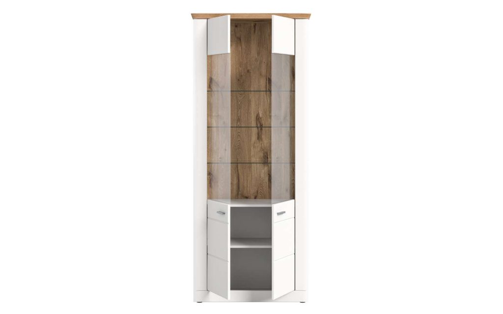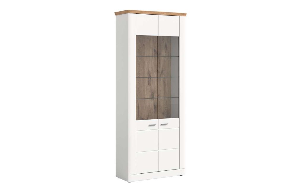 BemerkungStauraumvitrine mit Front aus MDF in Weiß, matt, tiefgezogen, Korpus in Weiß, matt, Absetzung und Rückwand in Nox Oak Nachbildung, Griffe aus Kunststoff in Nickelfarbig, Kunststofffüße in Schwarz, 2 Türen mit Glaseinsatz, 1 Einlegeböden, 1 Konstruktionsboden, ohne Beleuchtung, B/H/T ca. 85 x 205 x 37 cm.