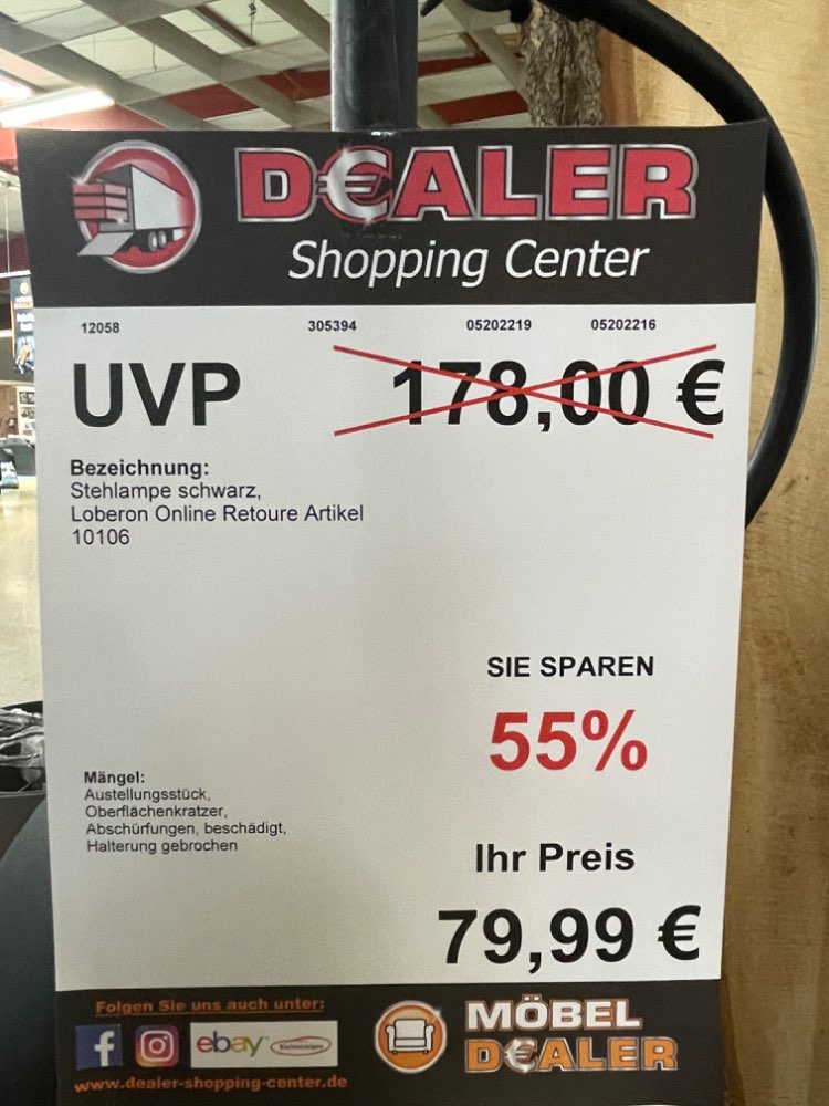 Bemerkung Mach deinen Deal! Hierbei handelt es sich um ein Angebot vom Dealer Shopping Center! Standort des Artikels ist Zeitz Kretzschau. Details wie technische Daten oder Schäden entnehmen Sie dem Bild mit Preis. BEZAHLUNG:  Bargeld, EC-Kartenzahlung, Kreditkarte oder 0% Finanzierung mit Consors Bank. RESERVIERUNG: Bei einem längeren Anfahrtsweg und vorheriger Absprache mit dem Verkäufer vor Ort ist eine Reservierung, für die Dauer der Fahrt -maximal  jedoch für 4 Stunden- möglich. Von Sonderanfragen bitten wir abzusehen. WICHTIG Bitte telefonisch erfragen ob der Wunschartikel noch verfügbar ist. Zwischenverkauf vorbehalten. Die Besichtigung, der Verkauf und die Abholung erfolgt ausschließlich bei unserem Handelspartner. Dealer Shopping Center , 06712 Kretzschau Zeitz Grana, Leipziger Straße 18, Ihren Ansprechpartner erreichen Sie telefonisch unter 015906377060 Öffnungszeiten : MO-FR 9:00-18:00 Uhr, SA 9:00 – 14:00 Uhr. Alle Inserate sind unverbindlich. Preisirrtümer und Änderungen vorbehalten. Abbildung ähnlich. Mehrere Rabattaktionen sind nicht kombinierbar. Weitere sichtbare Artikel können bei Verfügbarkeit zusätzlich erworben werden!