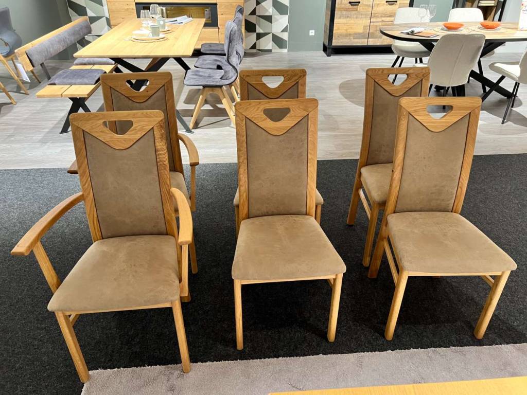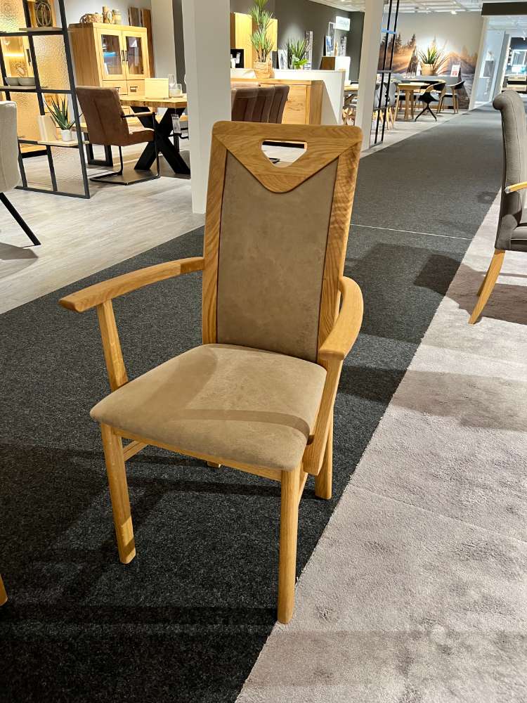 Polsterstuhl (ohne Armlehne, 4x) Bezug: Stoff Valentina darkbeige Holzausführung: Wildeiche geölt Polstersessel (mit Armlehne, 2x) Bezug: Stoff Valentina darkbeige Holzausführung: Wildeiche geölt