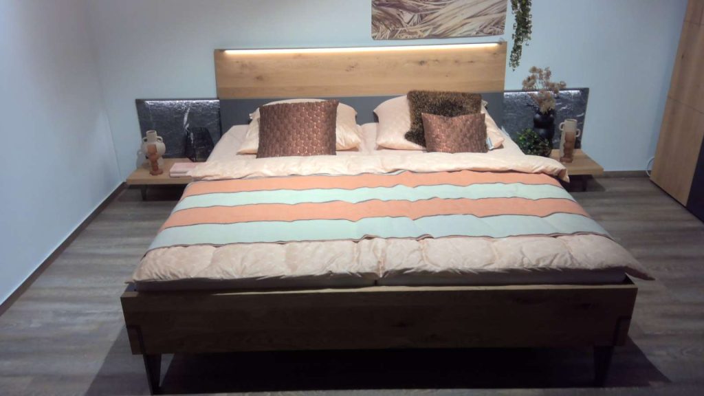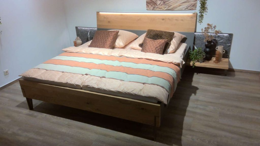BemerkungEntdecken Sie das elegante und moderne Schlafzimmer-Set "Milo" von THIELEMEYER, das mit einer harmonischen Kombination aus hochwertigen Materialien und durchdachtem Design besticht. Die Lackierung in edlem Graphit bildet einen faszinierenden Kontrast zu den warmen Tönen von Wildeiche, die den Möbelstücken eine natürliche und einladende Ausstrahlung verleihen. Besonders hervorzuheben sind die exklusiven Natursteineinsätze, die nicht nur optisch begeistern, sondern auch mit einer sanften Beleuchtung für ein stimmungsvolles Ambiente sorgen.