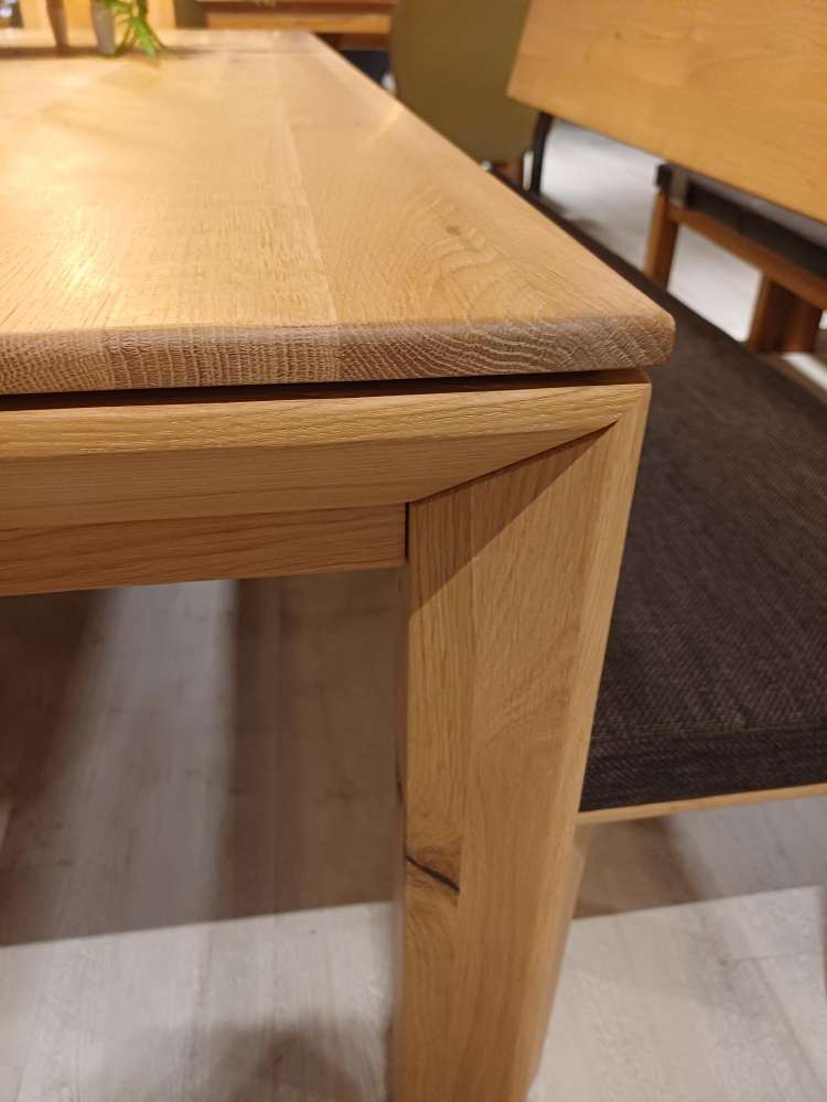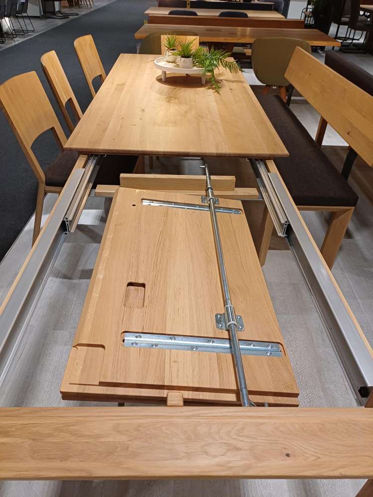 rustikale Asteiche massiv bianco geölt, Tisch mit Gestellauszug, 1 Bank Holzrücken Stoffsitz, 5 Stühle (3+2) 200(+80)x95cm