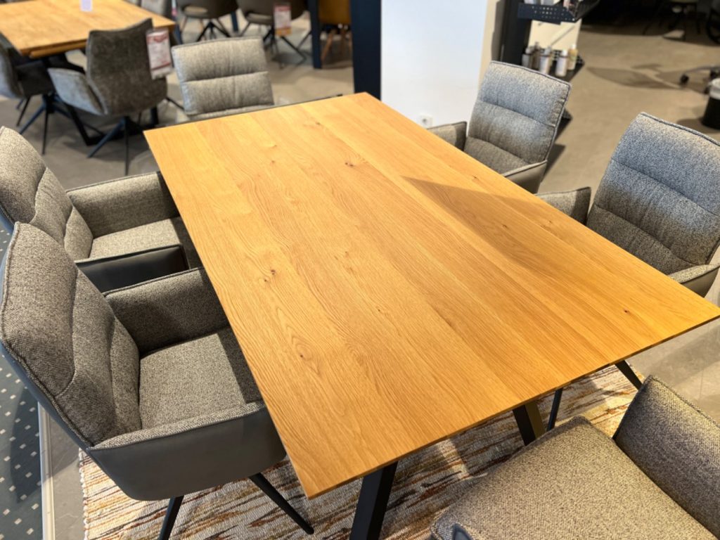 BemerkungEntdecken Sie den eleganten und funktionalen Charme unseres Ausziehtisches in der warmen Farbe Charaktereiche, kombiniert mit stilvollem schwarzen Metall. Als Ausstellungsware verkörpert dieses Möbelstück zeitgenössische Ästhetik und praktisches Design. Der Tisch verleiht Ihrem Wohnraum nicht nur eine einladende Atmosphäre, sondern bietet dank seiner Ausziehfunktion auch die Flexibilität, Gäste bequem zu bewirten. Perfekt für gesellige Abende mit Freunden oder ausgedehnte Familienessen, passt dieser Tisch sich Ihren Bedürfnissen an und schafft gleichzeitig einen stilvollen Mittelpunkt in Ihrem Zuhause. Die hochwertige Verarbeitung vereint edle Materialien und Robustheit, was diesen Tisch zu einem Muss für designbewusste Haushalte macht. Lassen Sie sich von der harmonischen Verbindung aus natürlichem Holz und modernem Metall inspirieren und genießen Sie die vielseitigen Einsatzmöglichkeiten, die Ihnen dieses edle Möbelstück bietet.