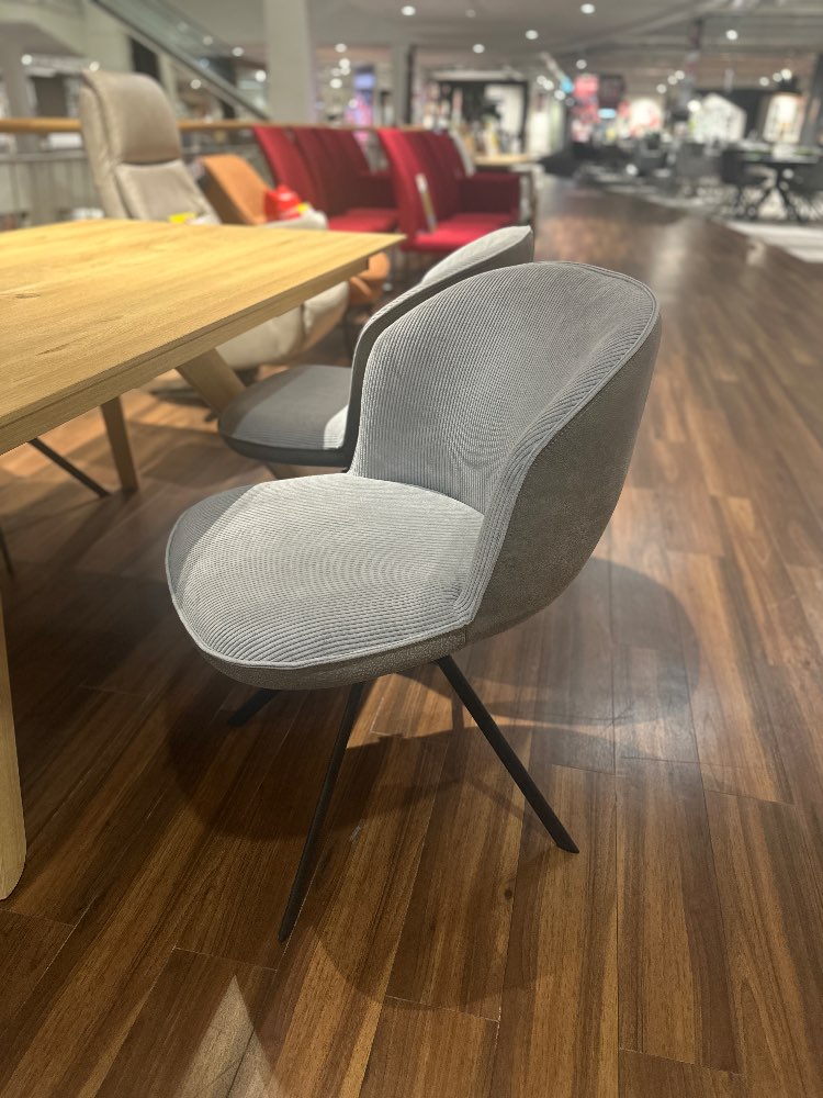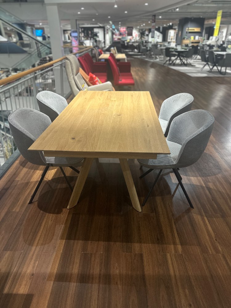 Tisch: Wildeiche hell soft gebürstet geölt massiv, Stuhl: Innen Stoffbezug hellgrau, Außen Lederbezug Stone