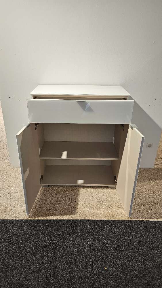 Besonders praktisch sind die zwei Türen und der Schubkasten, die mit einem sanften Softeinzug ausgestattet sind. Diese Funktion sorgt dafür, dass die Türen und Schubladen leise und mühelos schließen. Für zusätzliche Stabilität und Flexibilität sorgen integrierte Gleiter, die das Bewegen der Kommode erleichtern. Mit ihrem großzügigen Stauraum von B/H/T ca. 80x96x40 cm bietet die Kommode genügend Platz für Ihre persönlichen Gegenstände. Der alufarbene Griff setzt einen modernen Akzent, der die hochwertige Verarbeitung des Möbels unterstreicht.