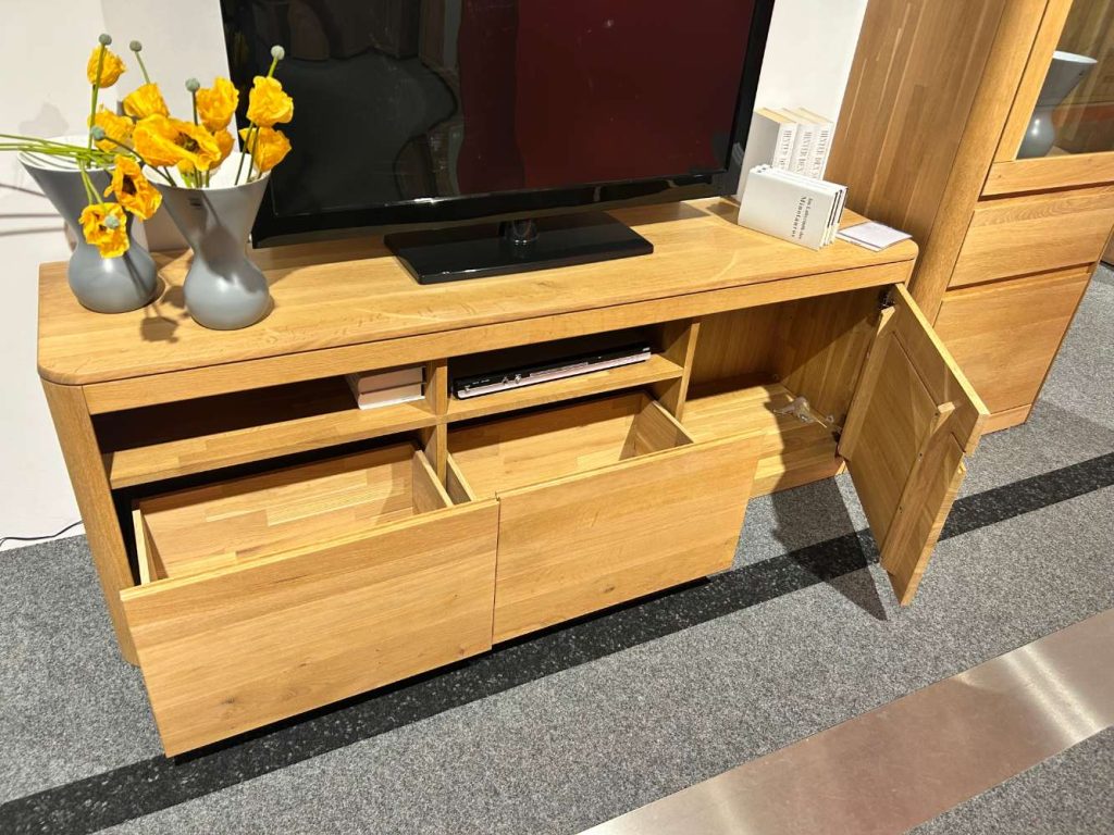 Wildeiche bianco massiv geölt Kanten/Rückwand: Wildeiche bianco furniert Griff: Griffmulde mit 2 Schubkästen, 2 Geräte- fächern und 1 Holztür, inkl. Kabeldurchlass 60mm BHT ca. 170 x 60 x 41 cm