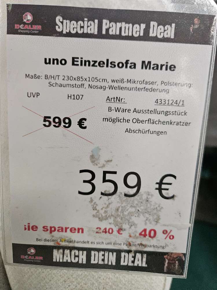 Bemerkung Mach deinen Deal! Hierbei handelt es sich um ein Angebot vom Dealer Shopping Center! Standort des Artikels ist Zeitz Kretzschau. Details wie technische Daten oder Schäden entnehmen Sie dem Bild mit Preis. BEZAHLUNG:  Bargeld, EC-Kartenzahlung, Kreditkarte oder 0% Finanzierung mit Consors Bank. RESERVIERUNG: Bei einem längeren Anfahrtsweg und vorheriger Absprache mit dem Verkäufer vor Ort ist eine Reservierung, für die Dauer der Fahrt -maximal  jedoch für 4 Stunden- möglich. Von Sonderanfragen bitten wir abzusehen. WICHTIG Bitte telefonisch erfragen ob der Wunschartikel noch verfügbar ist. Zwischenverkauf vorbehalten. Die Besichtigung, der Verkauf und die Abholung erfolgt ausschließlich bei unserem Handelspartner. Dealer Shopping Center , 06712 Kretzschau Zeitz Grana, Leipziger Straße 18, Ihren Ansprechpartner erreichen Sie telefonisch unter 015906377060 Öffnungszeiten : MO-FR 9:00-18:00 Uhr, SA 9:00 – 14:00 Uhr. Alle Inserate sind unverbindlich. Preisirrtümer und Änderungen vorbehalten. Abbildung ähnlich. Mehrere Rabattaktionen sind nicht kombinierbar. Weitere sichtbare Artikel können bei Verfügbarkeit zusätzlich erworben werden!