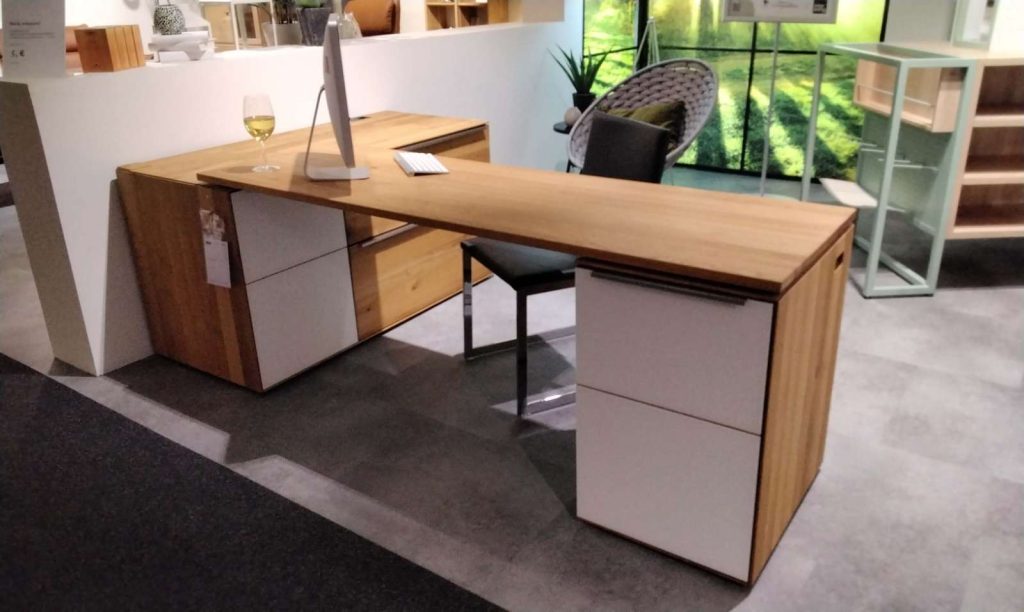 Ausführungca. 182 x 76 x 60 cm mit Schwenk-Oberboden, Asteiche naturbelassen geölt PG 1, Akzentfläche weiß satiniert optiwhite, Winkel-Schreibtischfunktion, Container rechts, inkl. Kabeldurchlass und Kabelmanagement mit 2x USB-Anschluss