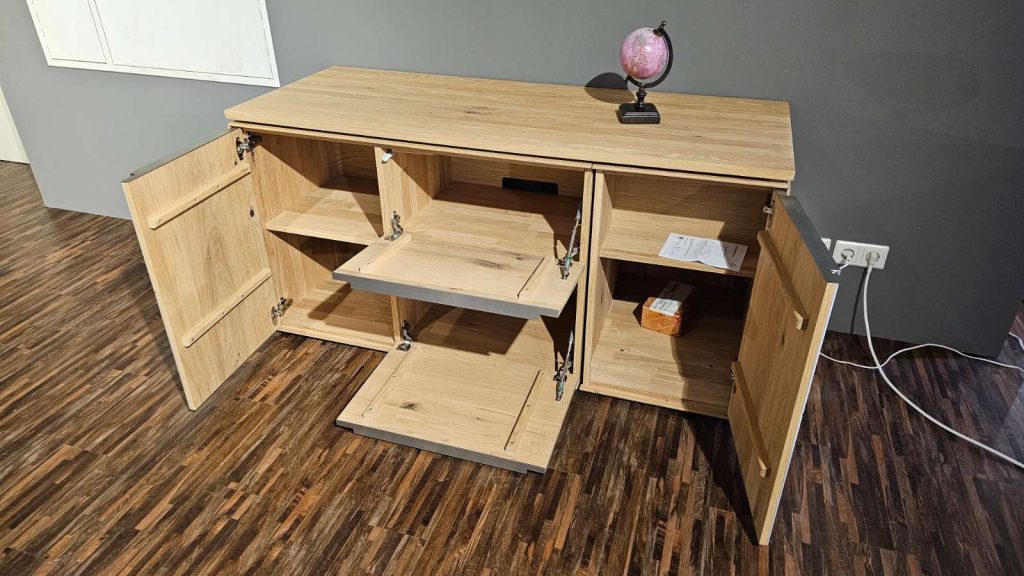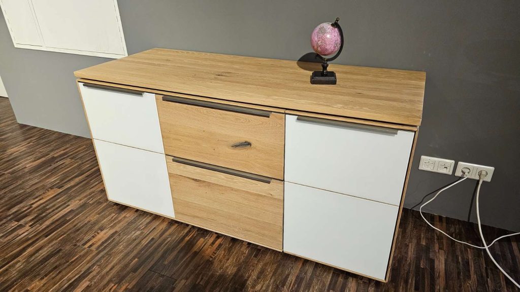 AusführungFront und Korpus: Asteiche massiv, geölt Akzentfläche: weiß satiniert, optiwhite Griffe: Griffleisten Edelstahloptik, Winkel Schreibtischfunktion mit Schwenk-Oberboden Container davorstehend links inkl. Kabeldurchlass in Rückwand ca. 152x76x60 cm bestehend aus: Front vorne 2 Holztüren Außen inkl. 2 Holzböden 2 Klappen Mitte Front hinten 1 Schubkasten oben 1 Holztür unten