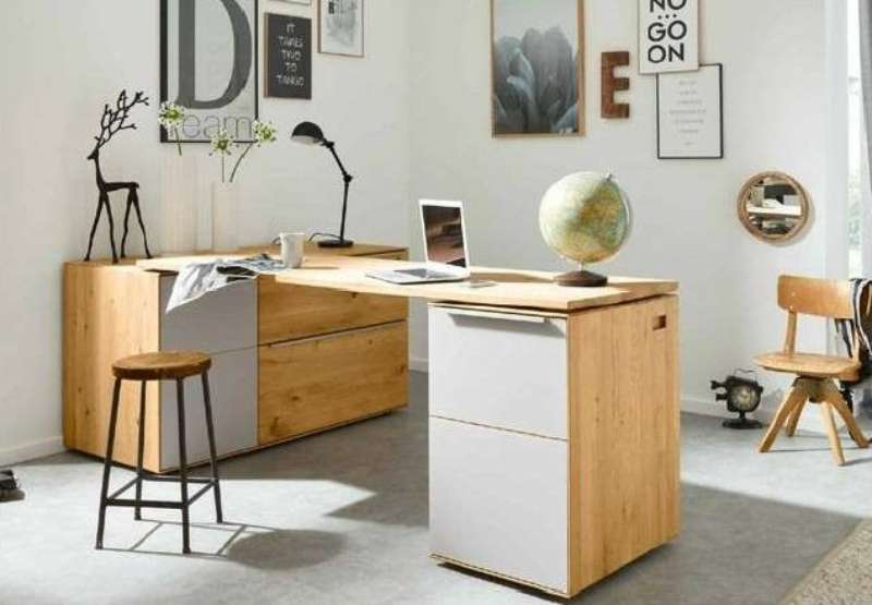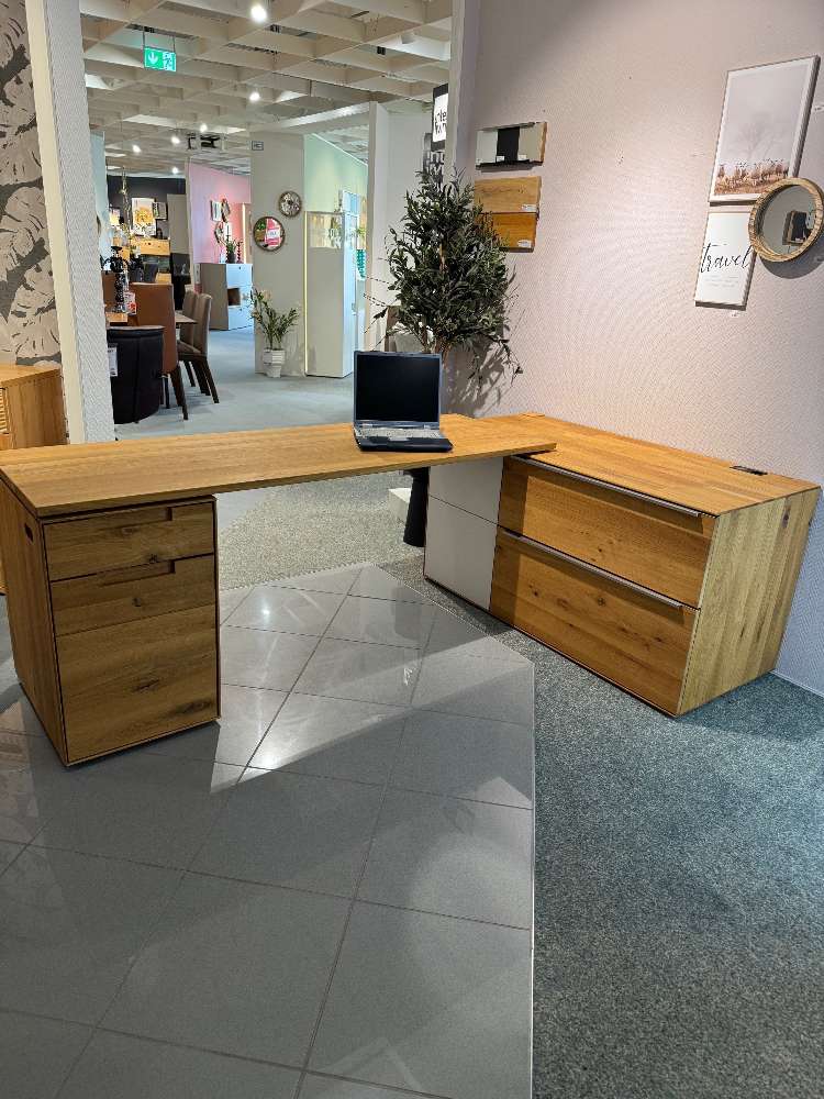 Winkelschreibtischfunktion mit Rollcontainer links (davorstehend), li+re je 1 Holztüre mittig 2 Klappen, B 182/H 76/T 60 cm Raumtiefe ausgez. 228 cm