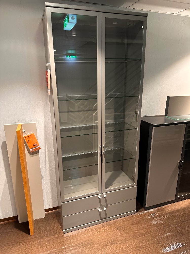 Bemerkung Diese moderne Vitrine, die ursprünglich als Ausstellungsstück genutzt wurde, verbindet Funktionalität mit einem eleganten Design. Mit den Maßen 90 cm in der Breite, 218 cm in der Höhe und 39 cm in der Tiefe, fügt sich dieses Möbelstück nahtlos in verschiedene Wohnräume ein, ohne übermäßig viel Platz einzunehmen. Die Vitrine bietet ausreichend Fläche, um Ihre wertvollsten Sammlerstücke, Erinnerungsstücke oder dekorativen Objekte stilvoll zu präsentieren. Aufgrund ihrer Größe eignet sie sich auch hervorragend als optisches Highlight in Ihrem Wohnzimmer oder Speisezimmer. Die klare Linienführung und das durchdachte Design unterstreichen ihre hochwertige Verarbeitung, während die Verwendung von Glas und Holz die perfekte Balance zwischen traditionellem Charme und moderner Eleganz schafft. Dieses besondere Stück zieht nicht nur Blicke auf sich, sondern bereichert auch das Ambiente Ihres Zuhauses.
