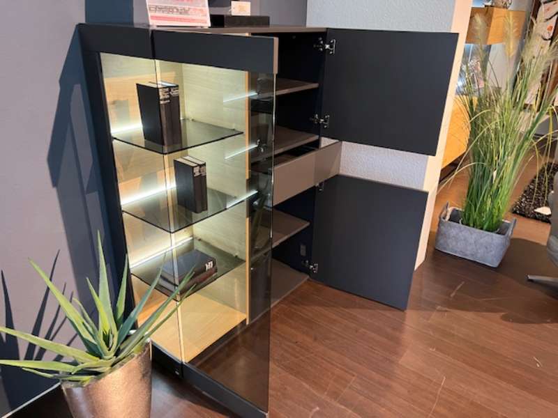 Bemerkung Tauchen Sie ein in die elegante Welt des modernen Designs mit der Media Design Vitrine in der exklusiven Farbgebung Lack schieferfarbig anthrazit. Dieses beeindruckende Möbelstück vereint zeitgemäße Ästhetik mit funktionalem Design und wird zum Mittelpunkt Ihrer Wohnräume. Der edle Materialmix aus Lack und robuster Wildeiche verleiht der Vitrine sowohl eine raffinierte Optik . Mit Abmessungen von ca. 106 x 147 x 40 cm bietet die Vitrine( Highboard) großzügigen Stauraum, perfekt um Ihre wertvollen Sammlungen oder dekorativen Objekte stilvoll zur Schau zu stellen. Die Gleiter sorgen für Stabilität , während die dezente Farbgebung problemlos mit verschiedenen Einrichtungsstilen harmoniert. Sie ist ein exklusives Möbelstück, das Ihrem Zuhause nicht nur Charakter verleiht, sondern auch als funktionaler Blickfang dient. Entdecken Sie die zeitlose Schönheit und das innovative Design von Media Design und lassen Sie sich von der einzigartigen Verarbeitung begeistern.
