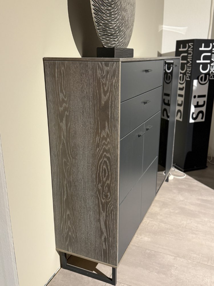 BemerkungDie Venezia Vitrine von MCA ist ein stilvolles Möbelstück, das Eleganz und Funktionalität perfekt vereint. Der Korpus der Vitrine ist in Vulcano Eiche furniert, was einen warmen und natürlichen Charme ausstrahlt. Im Kontrast dazu stehen die Fronten, die in einem edlen Softblack lackiert sind, wodurch das Möbelstück eine moderne und anspruchsvolle Ästhetik erhält. Die anthrazitfarbenen Metallkufen verleihen der Vitrine Stabilität und einen zugleich minimalistischen Look. Mit den Maßen von ca. 148x118x37 cm bietet sie ausreichend Platz zur Präsentation und Aufbewahrung von Gegenständen. Ein besonderes Highlight der Venezia Vitrine ist die integrierte Beleuchtung, die Ihre Lieblingsstücke effektvoll in Szene setzt und für eine angenehme Atmosphäre sorgt. Als Ausstellungsware präsentiert sie sich in einem nahezu makellosen Zustand und bringt einen Hauch von Luxus in Ihr Zuhause. Dieses Möbelstück ist nicht nur praktisch, sondern auch ein wahrer Blickfang für jeden Raum.