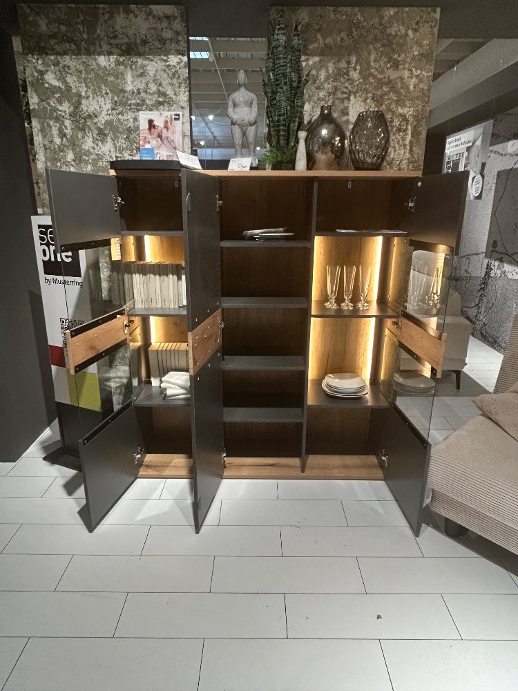 B / H / T: 134,8 x 154,6 x 40 cm Türen: - Art: Drehtür - Anzahl: 3 - Soft-Close-System: Ja - Türdämpfung: Nein Griffe: - Farbe: Schwarz - Art: Griffleiste Einlegeböden: - Anzahl: 10 - Max. Belastbarkeit pro Boden: 10 kg Farben: - Anthrazit - Eiche Inklusive: - Beleuchtung