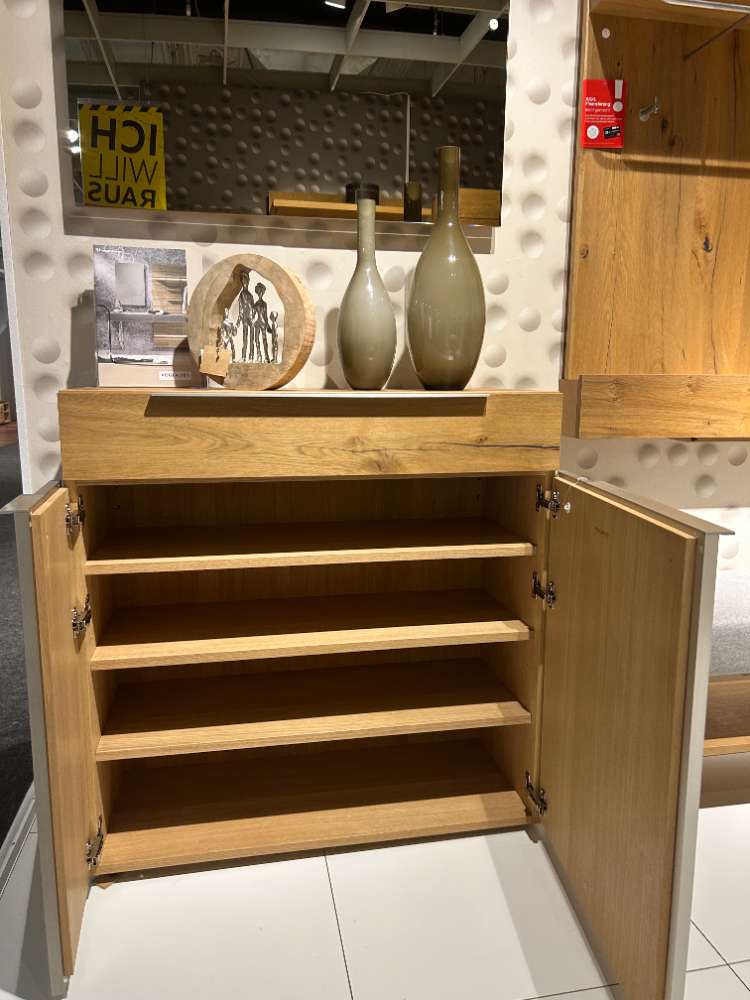 KOMMODE: B/H/T 96X98X43 , VOLLHOLZ |EICHE ALTHOLZ FURNIERT, |FR: GLAS ANTHRAZIT GARDEROBENBANK: B/H/T 91X49X40 EICHE |ALTHOLZ FURN, SITZ MIT LODEN |GRAUWEISS GEPOLSTERT WANDSPIEGEL: B/H/T 96X64X5 GARDEROBENPANEEL: B/H/T 91X114X40 VOLLHOLZ EICHE |ALTHOLZ FURNIERT, |MIT HUTABLAGE U. KLAPPE