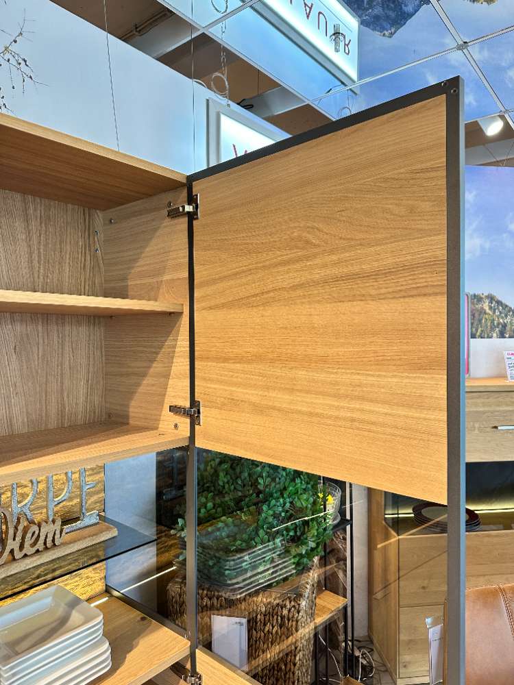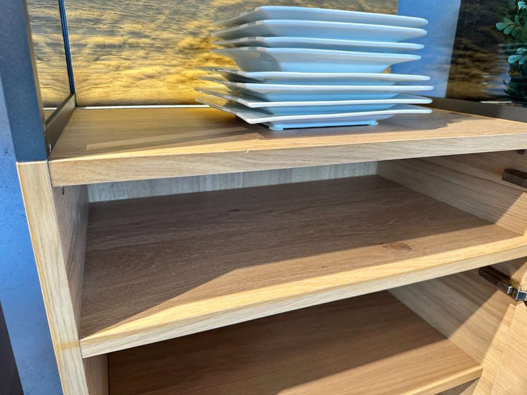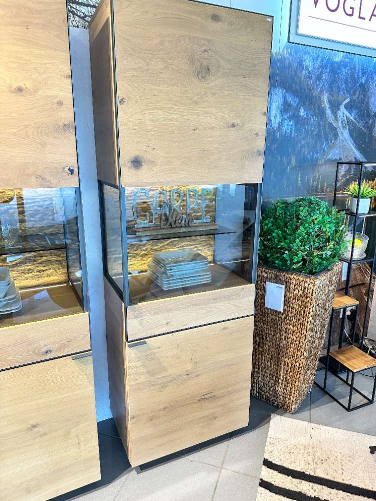 BemerkungSchöne Vitrine in Wildeiche Rustico, von Voglauer. Besonders schön ist die Innenbeleuchtung in Verbindung mit der Relief-Rückwand.