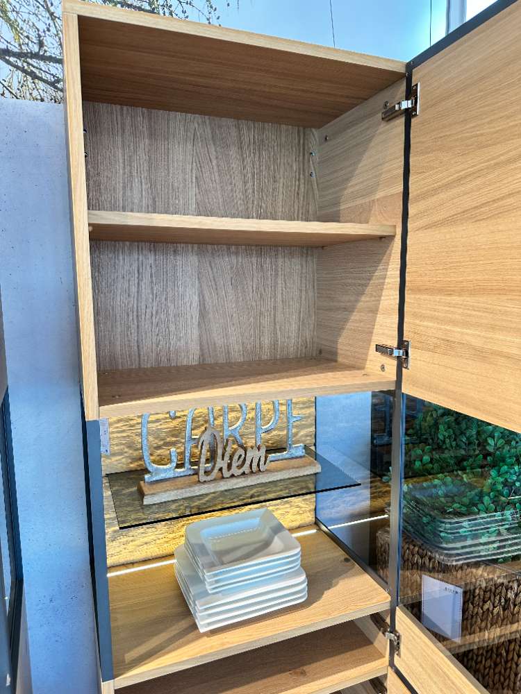 Hinter der Vitrinentür befinden sich einige Einlegeböden, die viel Stauraum bieten.
