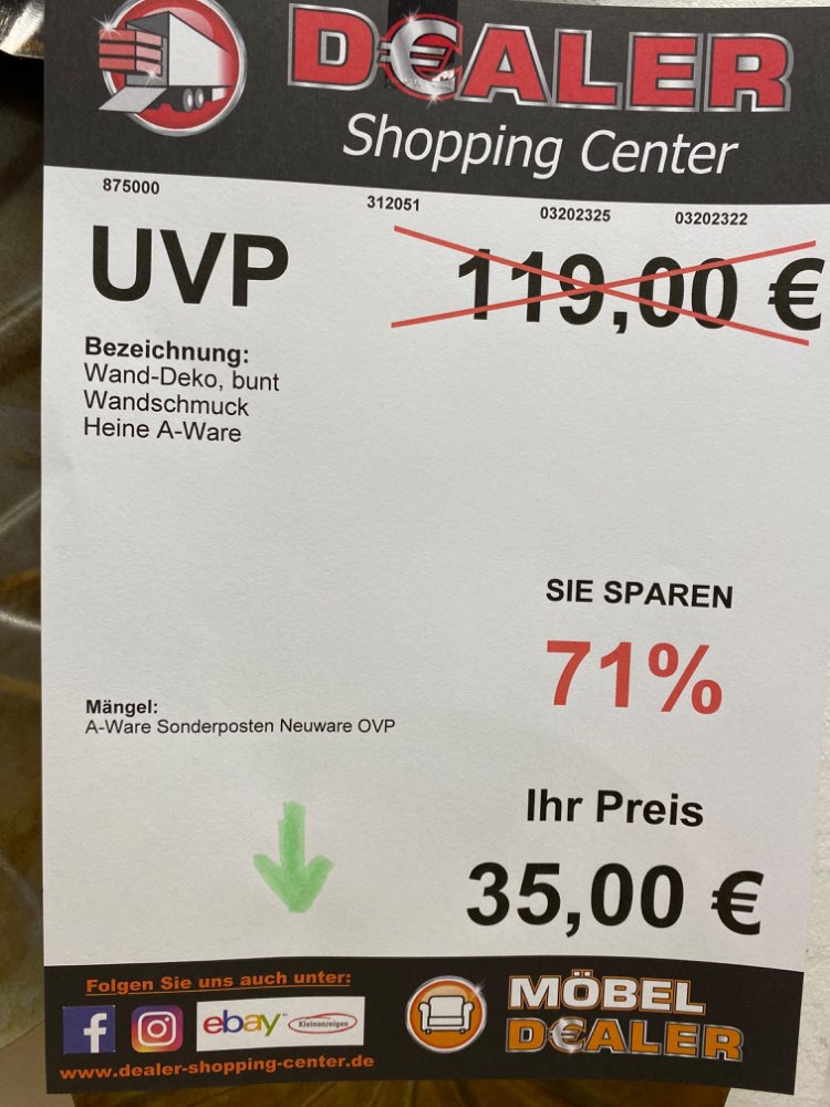 Bemerkung Mach deinen Deal! Hierbei handelt es sich um ein Angebot vom Dealer Shopping Center! Standort des Artikels ist Zeitz Kretzschau. Details wie technische Daten oder Schäden entnehmen Sie dem Bild mit Preis. BEZAHLUNG:  Bargeld, EC-Kartenzahlung, Kreditkarte oder 0% Finanzierung mit Consors Bank. RESERVIERUNG: Bei einem längeren Anfahrtsweg und vorheriger Absprache mit dem Verkäufer vor Ort ist eine Reservierung, für die Dauer der Fahrt -maximal  jedoch für 4 Stunden- möglich. Von Sonderanfragen bitten wir abzusehen. WICHTIG Bitte telefonisch erfragen ob der Wunschartikel noch verfügbar ist. Zwischenverkauf vorbehalten. Die Besichtigung, der Verkauf und die Abholung erfolgt ausschließlich bei unserem Handelspartner. Dealer Shopping Center , 06712 Kretzschau Zeitz Grana, Leipziger Straße 18, Ihren Ansprechpartner erreichen Sie telefonisch unter 015906377060 Öffnungszeiten : MO-FR 9:00-18:00 Uhr, SA 9:00 – 14:00 Uhr. Alle Inserate sind unverbindlich. Preisirrtümer und Änderungen vorbehalten. Abbildung ähnlich. Mehrere Rabattaktionen sind nicht kombinierbar. Weitere sichtbare Artikel können bei Verfügbarkeit zusätzlich erworben werden!