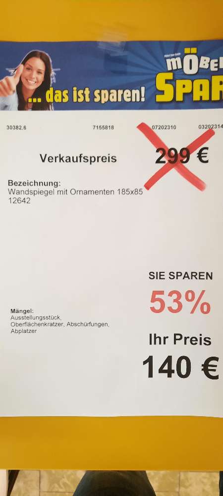 Bemerkung Hierbei handelt es sich um ein Angebot von Möbel Spar Standort des Artikels ist Merseburg Details wie technische Daten (Maße etc.) oder Schäden entnehmen Sie dem Bild mit Preis. RESERVIERUNG: Bei einem längeren Anfahrtsweg und vorheriger Absprache mit der Verkäuferin vor Ort ist eine Reservierung, für die Dauer der Fahrt maximal jedoch für 4 Stunden möglich. Von Sonderanfragen bitten wir abzusehen. VERSAND: Grundsätzlich bieten wir keinen Versand unserer Artikel an. Aufgrund von meist vorhandenen kleineren bis größeren Mängeln, ist ein Fernabsatzgeschäft nicht möglich. Da der Kunde die Mängel selbst vor Ort und Kauf sehen und dafür unterschreiben muss. Bei Kleinartikeln im Deko Bereich oder Restpostenbereich besteht ggf. die Möglichkeit fragen Sie uns hierzu einfach an. TRANSPORT: Wir selbst bieten keine direkten Zufuhren / Lieferungen an, haben aber in jeder Filiale Minimum einen externen Anbieter der dies für uns übernimmt. Die Kontaktdaten geben wir bei Interesse gerne weiter. Aus Haftungsgründen ist dies ein Fremdgeschäft und wird zwischen dem Kunden und dem Transportunternehmen getroffen und ist unabhängig von der Möbel Spar GmbH. UMLAGERUNG: Sie haben einen Artikel entdeckt welcher in einer anderen Filiale als Ihre nächstgelegene lagert? Kein Problem, wir bieten eine interne Umlagerung an. In diesem Fall muss der Kunde eine Anzahlung in dem Abholmarkt tätigen. Je nach Größe und Aufwand kann eine individuelle Transfergebühr berechnet werden. Der Kauf ist keine Pflicht, es wird aber bei Nichtgefallen und Wegfall des Verkaufes eine pauschale Bearbeitungsgebühr in Höhe von 15€ einbehalten, ebenso die ggf. angefallene Transfergebühr. WICHTIG: Bitte telefonisch erfragen ob der Wunschartikel noch verfügbar ist. Zwischenverkauf vorbehalten. Die Besichtigung, der Verkauf und die Abholung erfolgt ausschließlich bei unserem Handelspartner: MÖBEL SPAR GmbH ,06217 Merseburg, Einfahrt über Geusaer Str.15 Ihre Ansprechpartnerin Frau Pfeiff erreichen Sie telefonisch unter 017657890762 oder 034612756990