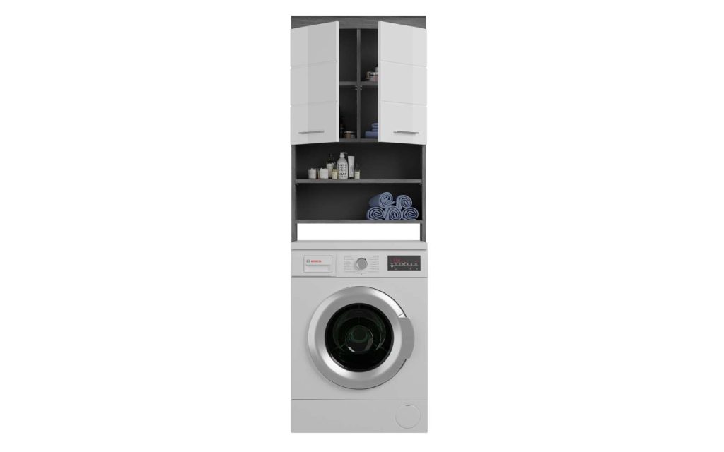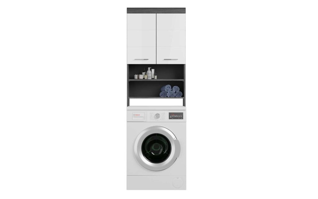 Bemerkung Waschmaschinenüberbau Scout, Rauchsilber Nachbildung/weiß Hochglanz Dieser Waschmaschinenüberbau darf in keinem Badezimmer fehlen. Der Korpus ist aus Spanplatte in Rauchsilber Nachbildung, die MDF Front in weiß Hochglanz, Griff aus Kunststoff in chromfarbig, Füße aus Kunststoff in silber. Die zwei Türen und zwei offenen Ablagefächer bieten viel Stauraum. B/H/T ca. 63 x 191 x 24 cm.