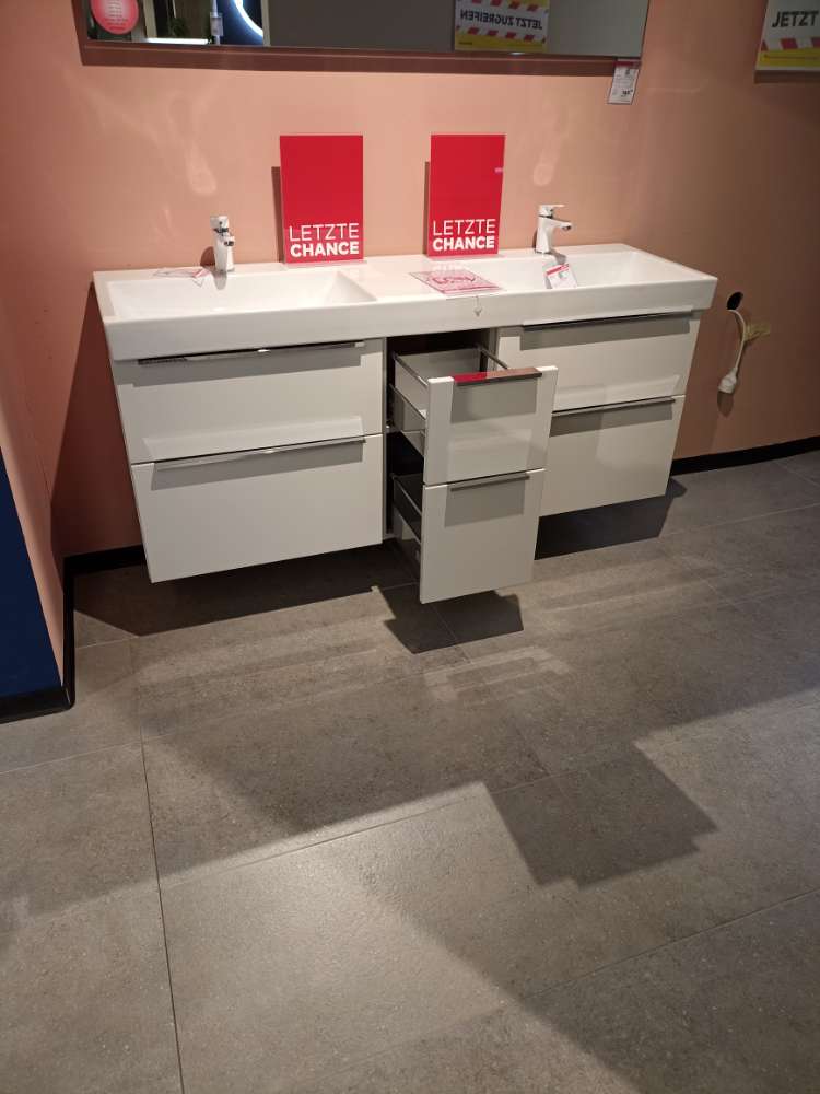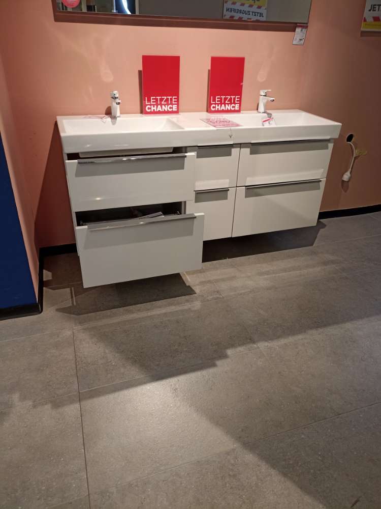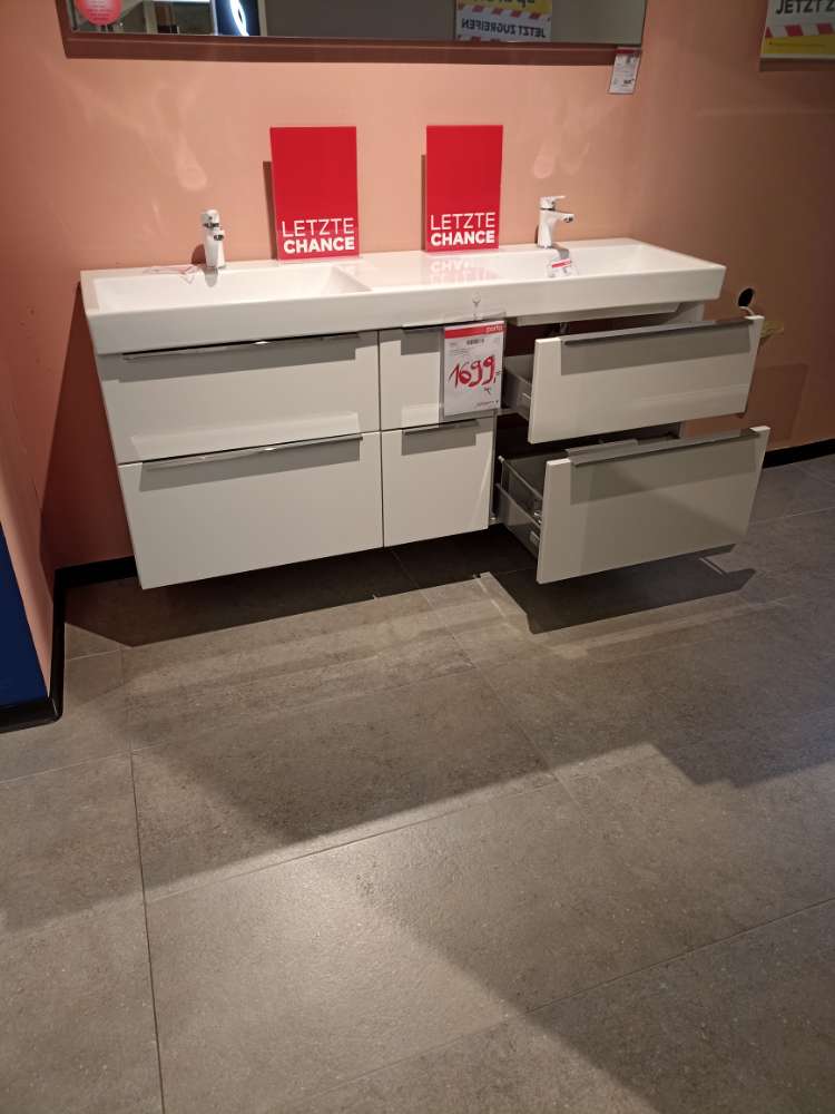 Waschplatz (ca. 150 cm breit) ohne Armatur darin enthalten: 1x Waschtischunterschrank 1x Keramik-Doppelwaschtisch 2x Clou-Systeme