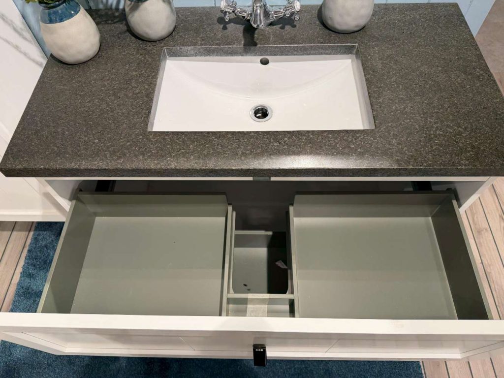 Bemerkung Gesamtset bestehend aus : *Waschtischkombination 100 cm* Front und Korpus: Fichte Massiv Weiß lackiert Griff: Leder Schwarz Bestehend aus: Waschtischunterschrank 2 Auszüge Granitplatte mit 1 Hahnloch Unterbau-Waschtisch Weiß Imprägnierung BHT ca. 101,50 x 70,00 x 49,00 cm *Hochschrank mit 1 Drehtür* Front: Fichte Massiv Weiß lackiert Korpus: MDF teilmassiv furniert Weiß lackiert Griff: Leder Schwarz BHT ca. 36,00 x 170,00 x 32,50 cm *Zweigriff-Armatur Chrom* inkl. Zugstange Spiegelschrank 1-türig Korpus: Fichte Massiv Weiß lackiert Griff: Leder Schwarz BHT ca. 67 x 92 x 14 cm
