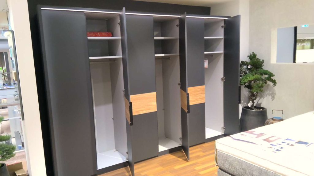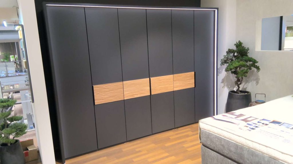 Bemerkung Der Drehtürenschrank Acapulco von WIEMANN besticht durch sein elegantes Design und hochwertige Verarbeitung. In einem stilvollen Graphit-Dekor präsentiert er sich als zeitloses Möbelstück, das durch die edlen Absetzungen aus massivem Riffholz einen natürlichen und warmen Akzent erhält. Mit seinen großzügigen Maßen von ca. 300 cm Breite, 216 cm Höhe und 58 cm Tiefe bietet der Schrank nicht nur reichlich Stauraum, sondern überzeugt auch durch seine Präsenz im Raum. Dieser Schrank, der als Ausstellungsware verfügbar ist, eignet sich ideal für all jene, die Wert auf ein stilvolles und funktionales Schlafzimmer legen. Ein besonderes Highlight ist der Passepartout-Rahmen mit integrierter LED-Beleuchtung, der nicht nur für stimmungsvolle Lichtakzente sorgt, sondern auch die gesamte Raumatmosphäre positiv beeinflusst. Der Acapulco Drehtürenschrank vereint Funktionalität mit einem Hauch von Luxus, der jedem Wohnraum eine besondere Note verleiht.