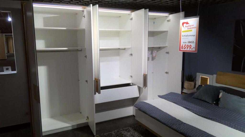 BemerkungEntdecken Sie mit dem WSL 6000 von WÖSTMANN eine Kombination aus zeitloser Eleganz und moderner Funktionalität. Dieses Möbelset, bestehend aus einem großzügigen Kleiderschrank und einem stilvollen Doppelbett, wurde konzipiert, um Ihrem Schlafbereich eine eindrucksvolle Atmosphäre zu verleihen. Der Kleiderschrank beeindruckt mit seinen Maßen von ca. 301x223x62 cm und bietet großzügigen Stauraum, während das Doppelbett, mit seiner komfortablen Größe von ca. 180 x 200 cm, eine einladende Wohlfühloase schafft. Der raffinierte Lack in Weiß, gepaart mit der markanten Balkeneiche, verleiht den Möbeln eine edle und zugleich natürliche Ausstrahlung. Besonderes Highlight sind die integrierten Beleuchtungselemente in Bett und Kleiderschrank, die für eine warme und einladende Stimmung sorgen.