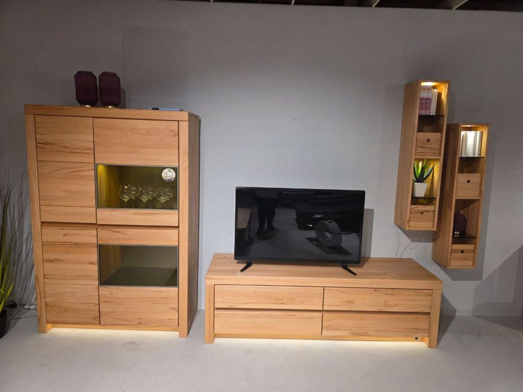 europäische Kernbuche massiv, soft gebürstet bestehend aus: -Vitrine mit 2 Holztüren links und 2 Holz-/Glastüren rechts -Medienelement mit 3 Schubkästen und 1 Medienklappe -2x Hängeregal mit 4 offenen Fächern BHT ca. 310 x 201 x 52 cm