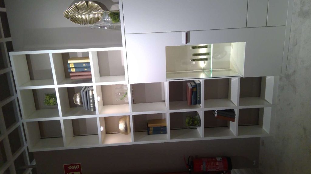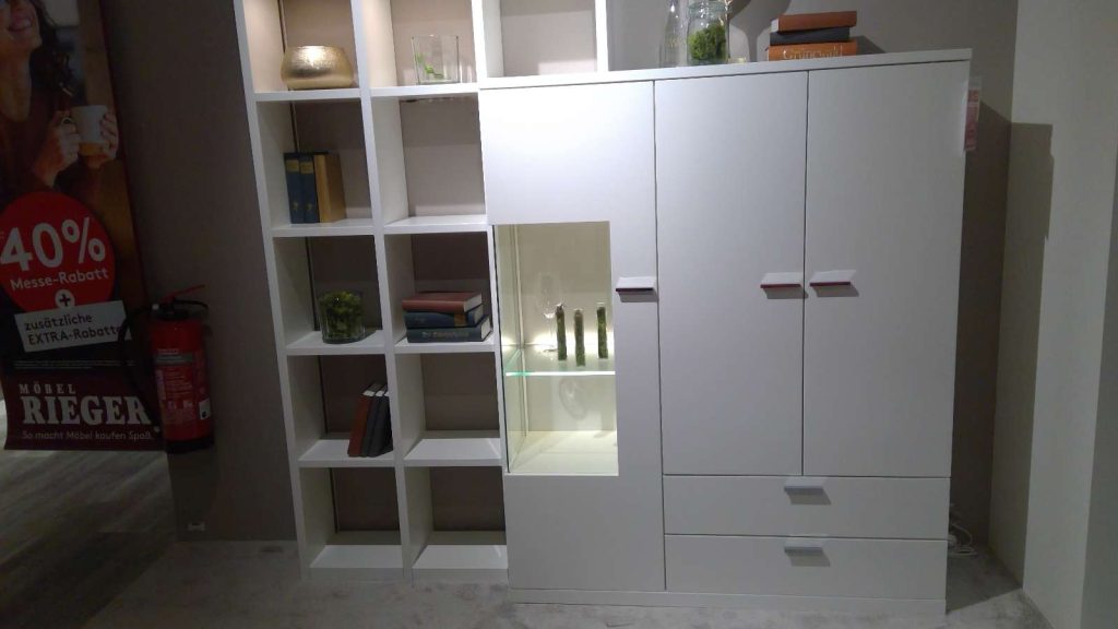 17 offene Regalflächen, 1 Türe mit Glas (+2 Holz- 1 Glaseinlegeboden), 2 Türen (3 Böden), 2 Schubladen, Griffe: Chrom glänzend