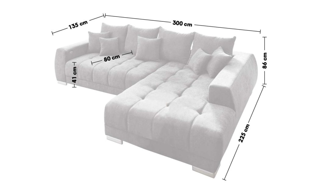 Wohnlandschaft aus Stoff Camaro 19, Federkern Sitzpolsterung, inklusive elektrischer Vorziehfunktion-stufenlos verstellbar, formschöne Holzfüße silber, 4 Rückenkissen, 3 mittlere Kissen, 2 Zierkissen. Maße ca. 300 x 225 cm.