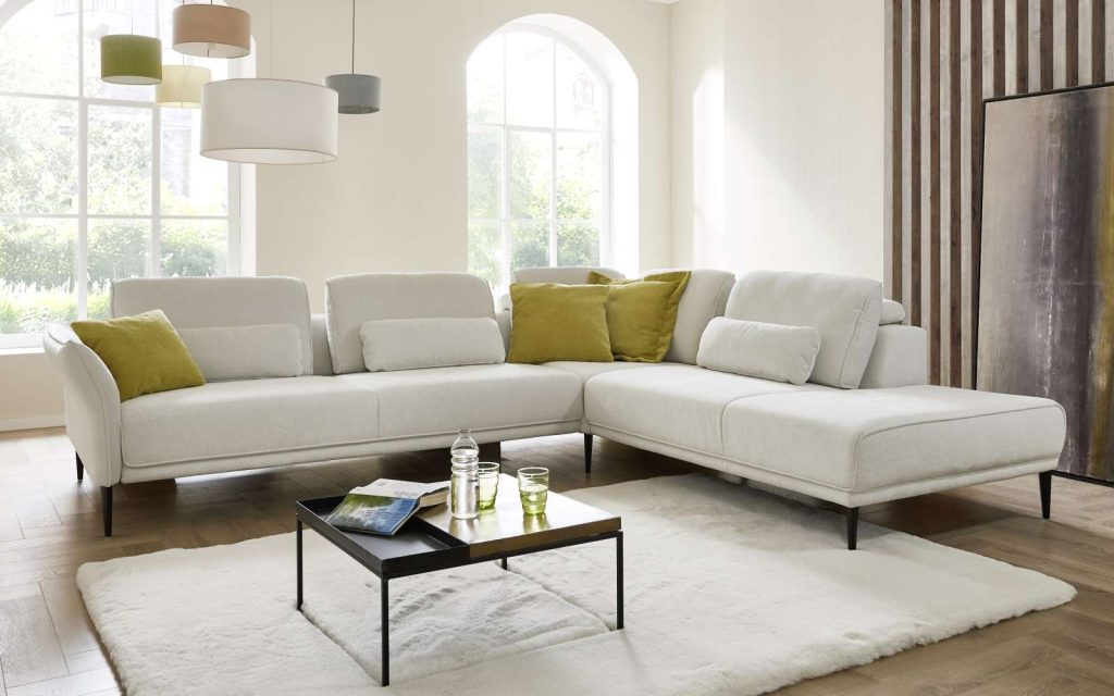 BemerkungModerne Wohnlandschaft mit weichem Stoffbezug Santos in Weiß, Softsitz mit zwei komfortablen Kaltschaumqulitäten in unterschiedlichen Härten und Höhen in einer Sandwichbauweise vereint, bequeme Oberfläche, Metallfüße in Schwarz, Rücken echt bezogen, lose vorgestellte Rückenkissen mit hochwertigem Kaltschaum und Fibreball-Steppmatte abgedeckt, harmoniert mit allen modernen Einrichtungsstilen, ohne Zierkissen und Vorziehfunktion, Stellmaß ca. 305 x 256 cm. Sitzhöhe ca. 45 cm. Sitztiefe mit Rückenkissen ca. 60 cm.