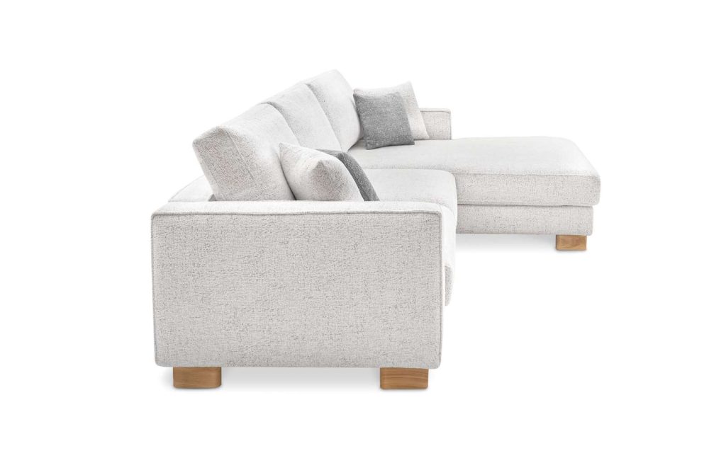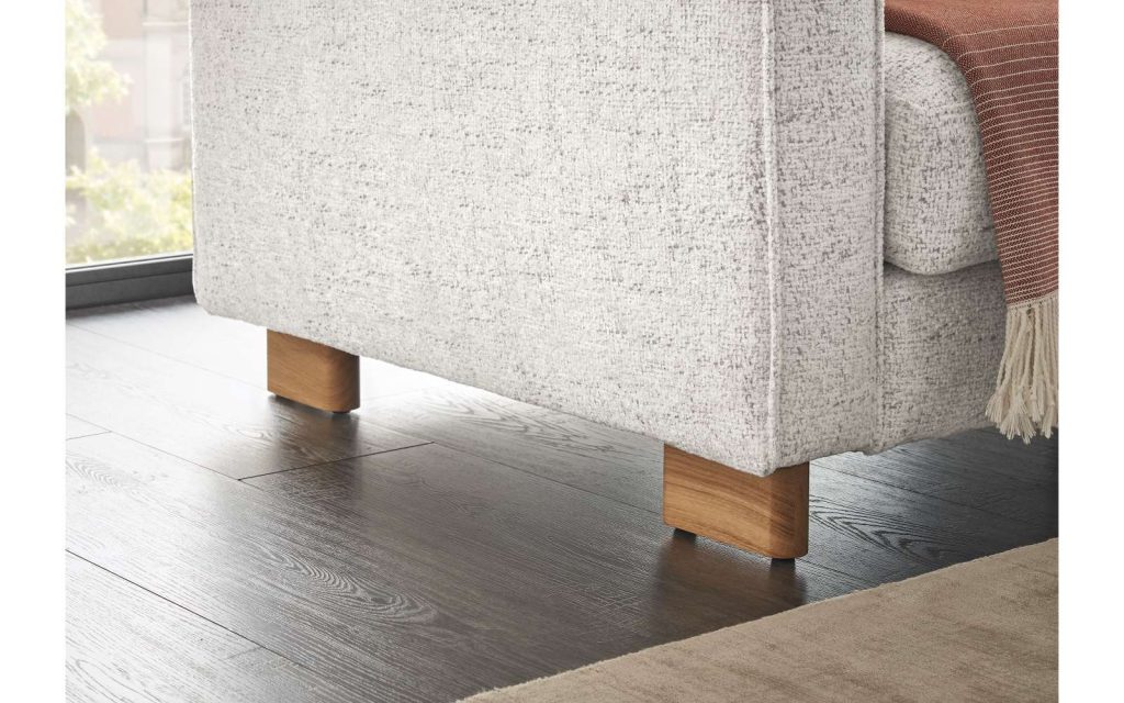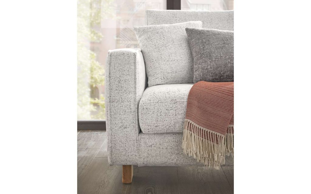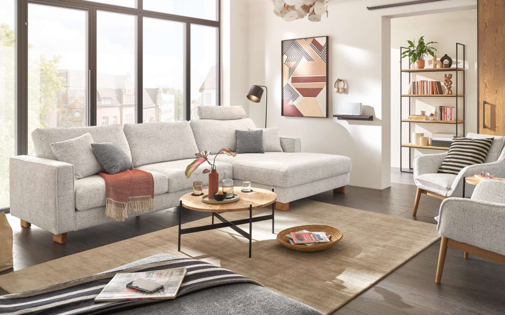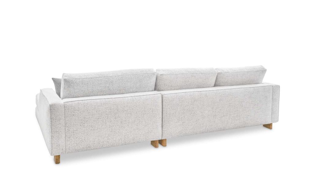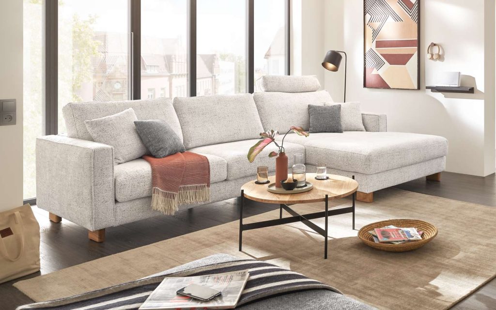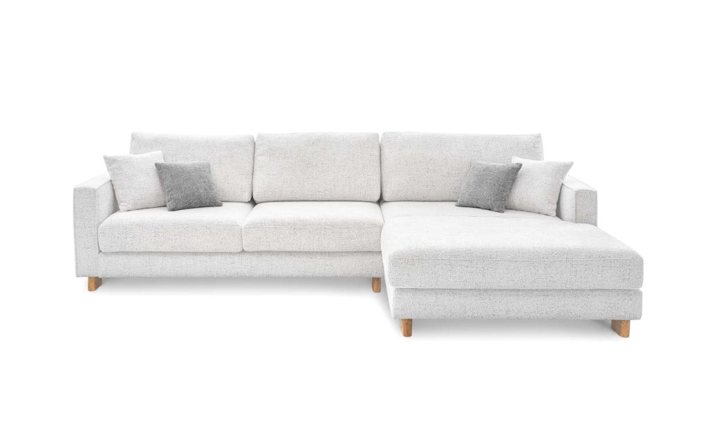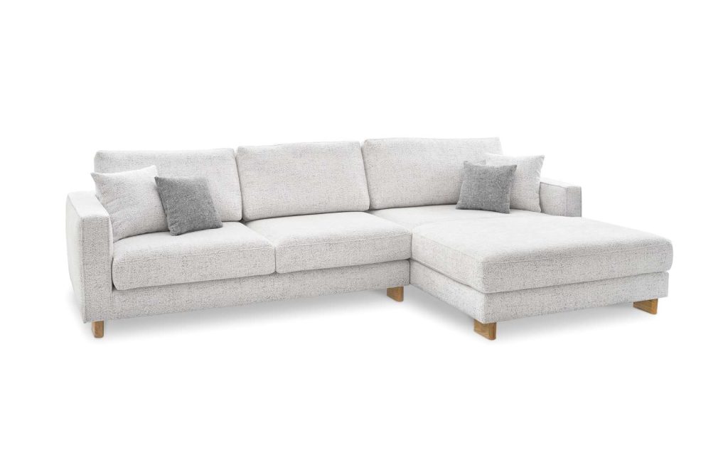 BemerkungWohnlandschaft mit Stoffbezug Phantom, Sitz mit Nosagfedern und Polyurethanschaum, Füße aus Natureiche, lackiert, inklusive 2 Kissen mit Reißverschluss, 45 x 45 cm, B/H/T ca. 318 x 90 x 186 cm.