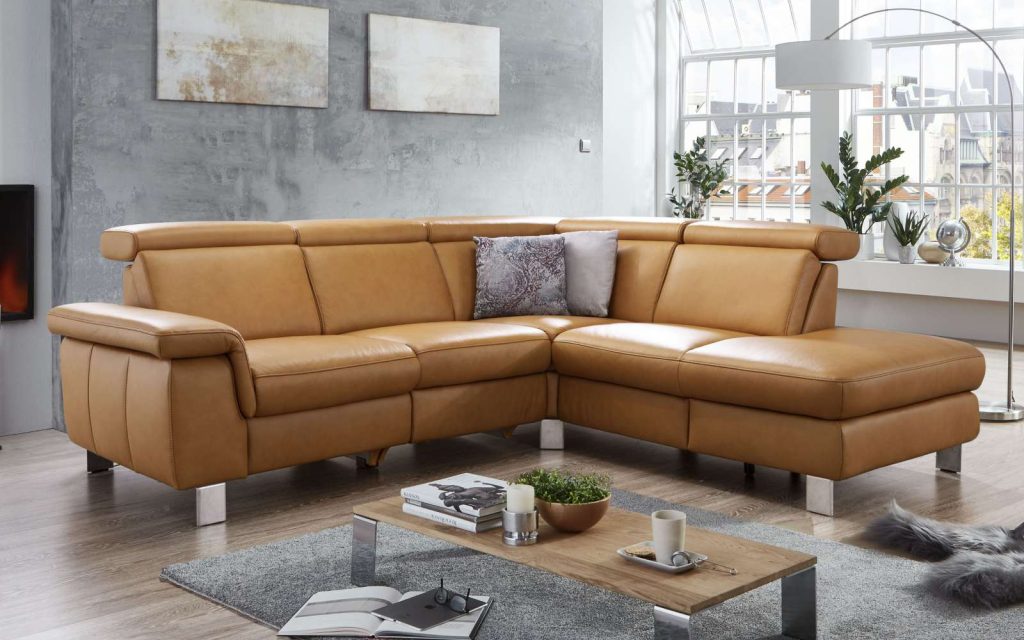 BemerkungWohnlandschaft Leder Punch in orange, komfortable PUR-Schaum Sitzpolsterung auf dauerelastischen Wellenfedern, formschöne Aluwinkelfüße gebürstet, Rücken unecht bezogen, Stellmaß ca. 272 x 242 cm.