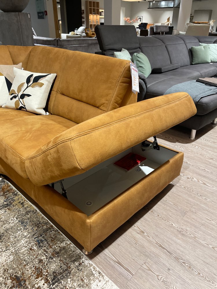 Der praktische Stauraum im Hockerelement ermöglicht es Ihnen, Kissen, Decken oder andere Gegenstände ordentlich zu verstauen. Außerdem ist der Rücken in der Ecke neigbar, was weiteren individuellen Sitzkomfort garantiert. Diese Wohnlandschaft ist somit nicht nur ein optischer Blickfang, sondern auch ein funktionales Möbelstück, das Ihren Alltag mit seinem durchdachten Design bereichert.