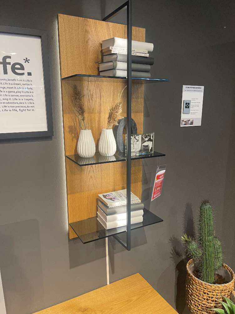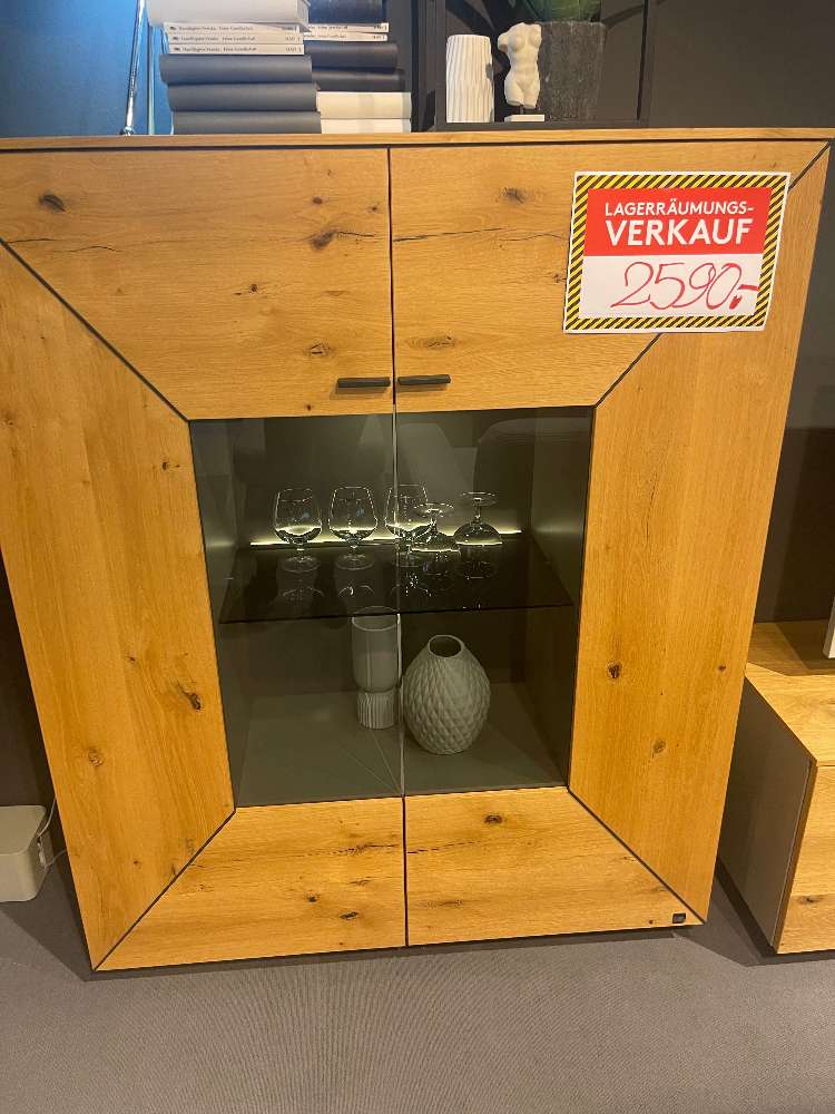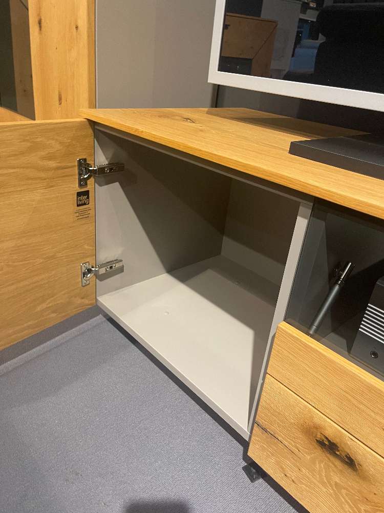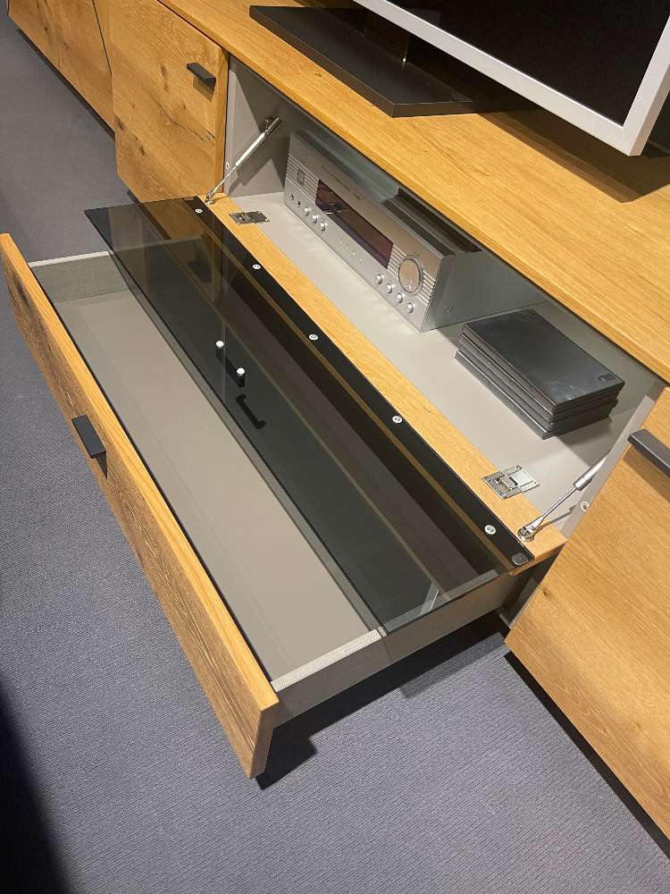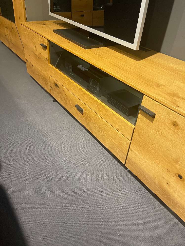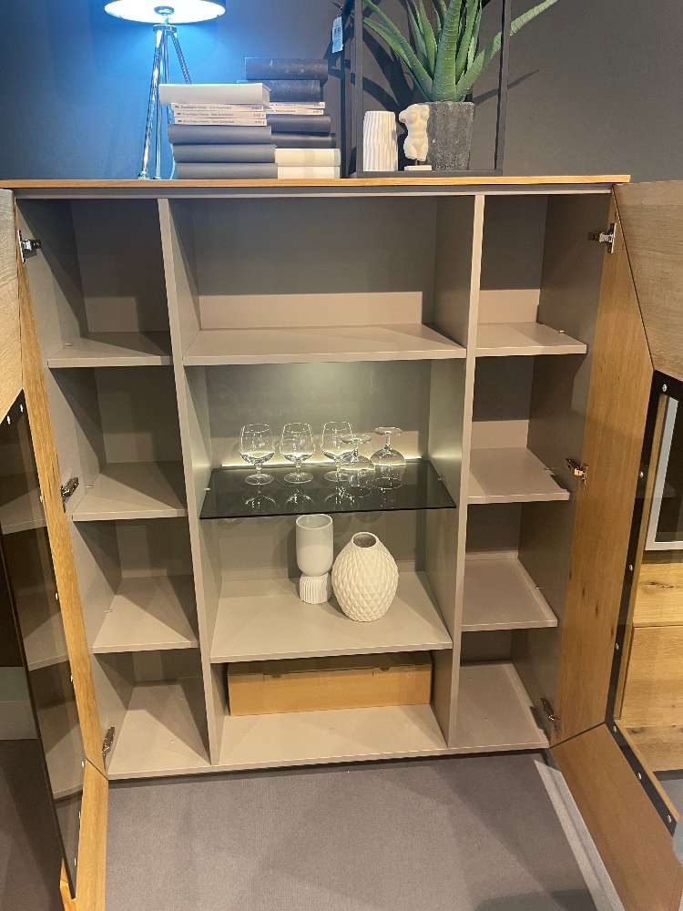- Balkeneiche Honig / Lack Fango seidenmatt - B/H/T: ca. 330x195x41/49cm - Highboard 2-trg. - Lowboard 2-trg. , 1x Schubkasten, 1x Klappe - Wandpaneel mit Glasböden - inkl. LED- Beleuchtung