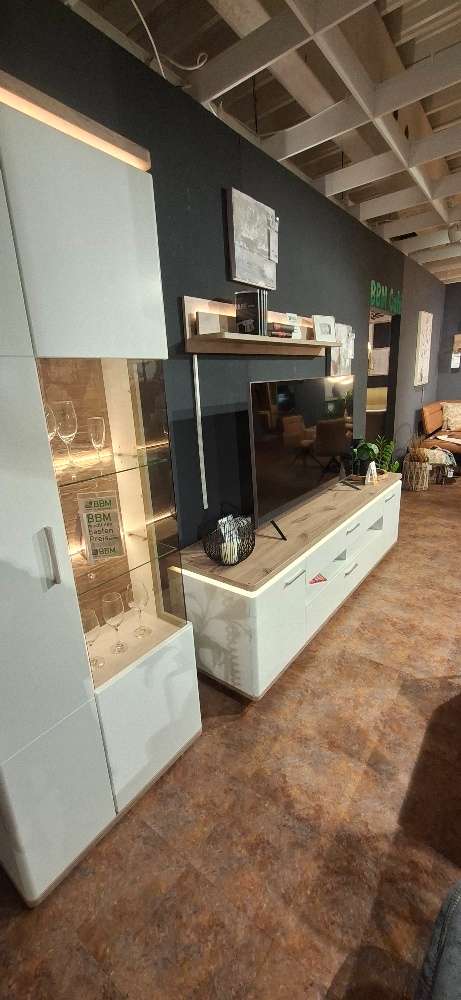 Das Produkt präsentiert sich in einem stilvollen Soft White und vereint modernes Design mit funktionaler Eleganz. Als Ausstellungsware zeigt es sich in seiner faszinierenden Komposition aus Vitrine, TV-Element und Wandbord, die neben praktischer, auch ästhetischen Nutzen bieten. Mit einer beeindruckenden Größe von 295x208x50 cm wird es zum markanten Mittelpunkt in jedem Wohnraum. Die integrierte LED Beleuchtung verleiht dem Ensemble eine besondere Aura, indem es bestimmte Elemente effektvoll in Szene setzt und dem Ambiente eine sanfte Note verliehen wird. Über das TV-Element lassen sich technologische Geräte harmonisch integrieren, während die Vitrine ausreichend Raum bietet, um Lieblingsstücke in Szene zu setzen. Das Wandbord rundet das gesamte Ensemble ab, indem es zusätzlichen Stauraum und Präsentationsfläche schafft. Dieses Produkt begeistert durch eine gelungene Mischung aus Funktionalität und Stil und überzeugt in jedem modernen Wohnkonzept.