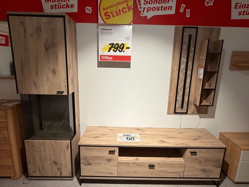 Funktion Vitrine mit 1 Holz-/Glastür, TV-Unterteil mit je 1 Holztür und Wandregal mit 4 Böden