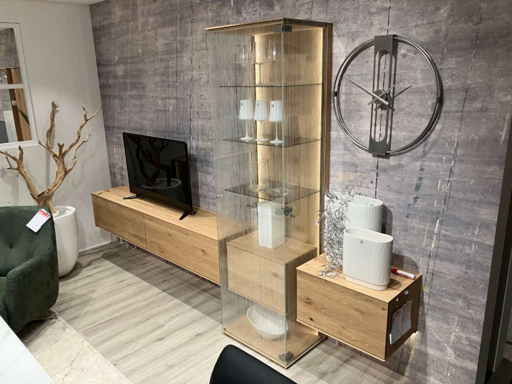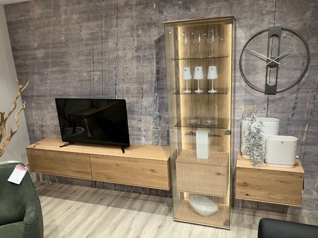 AusführungKerneiche massiv , gebürstet und lackiert. Bestehend aus : -Hängelowboard mit 1 Klappe -Standvitrine mit 1 Glastür links, dahinter 3 Glasböden und 1 Holzkorpus mit Klappe, Hängelowboard mit 1 Klappe