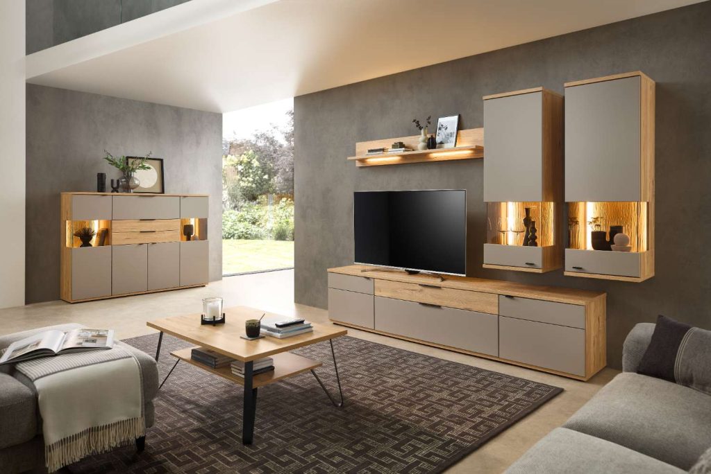 Wohnwand in Ausführung Grau matt / Risseiche Dekor, Rückwänd geschroppt B/H/T ca. 270x216x45 cm. Ohne Beleuchtung und Dekoration.